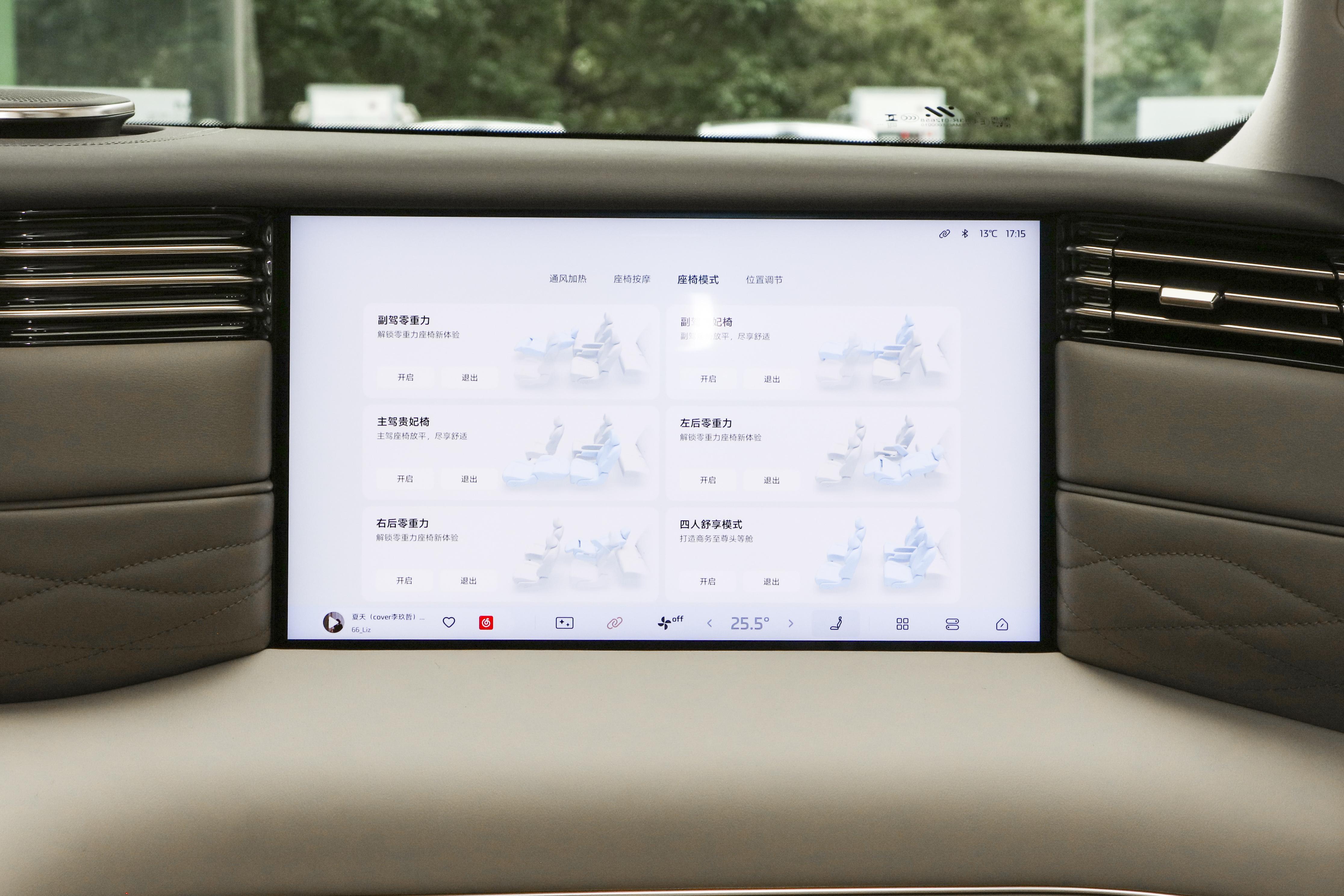 作爲一輛家用大六座SUV,空間是消費者的剛性需求,智己LS9採用2+2+2的六座佈局,車內空間利用率高達86%,這樣的數據在同級車型中表現突出。三排座椅都能提供舒展的乘坐空間,不會出第一排侷促的情況。第二排是兩個獨立的座椅,中間有通道,進出第三排特別方便。全車共配置三把零重力座椅,其中二排右側座椅可一鍵進入“懸浮式”休憩姿態,通過氣囊與機械結構的協同調節,實現114°-143°的無極角度調節,腿部支撐長度達265mm,接近MPV的空間利用率。座椅內置車規級機械臂,模擬人手推拿力道,銷售介紹說它提供5種古法經絡按摩法(如推拿、揉捏),力度遠超傳統氣袋式按摩,用戶實測反饋“接近商場付費按摩椅的體感”。三排設計得比較合理舒適,像我1米8的個子,調整好駕駛座後,坐到第二排還能有兩拳多的腿部空間。最 驚喜的是第三排,雖然比不上第二排,但短途乘坐沒問題,頭部和腿部都不覺得壓抑,比市面上很多七座SUV 的第三排要舒適多了。