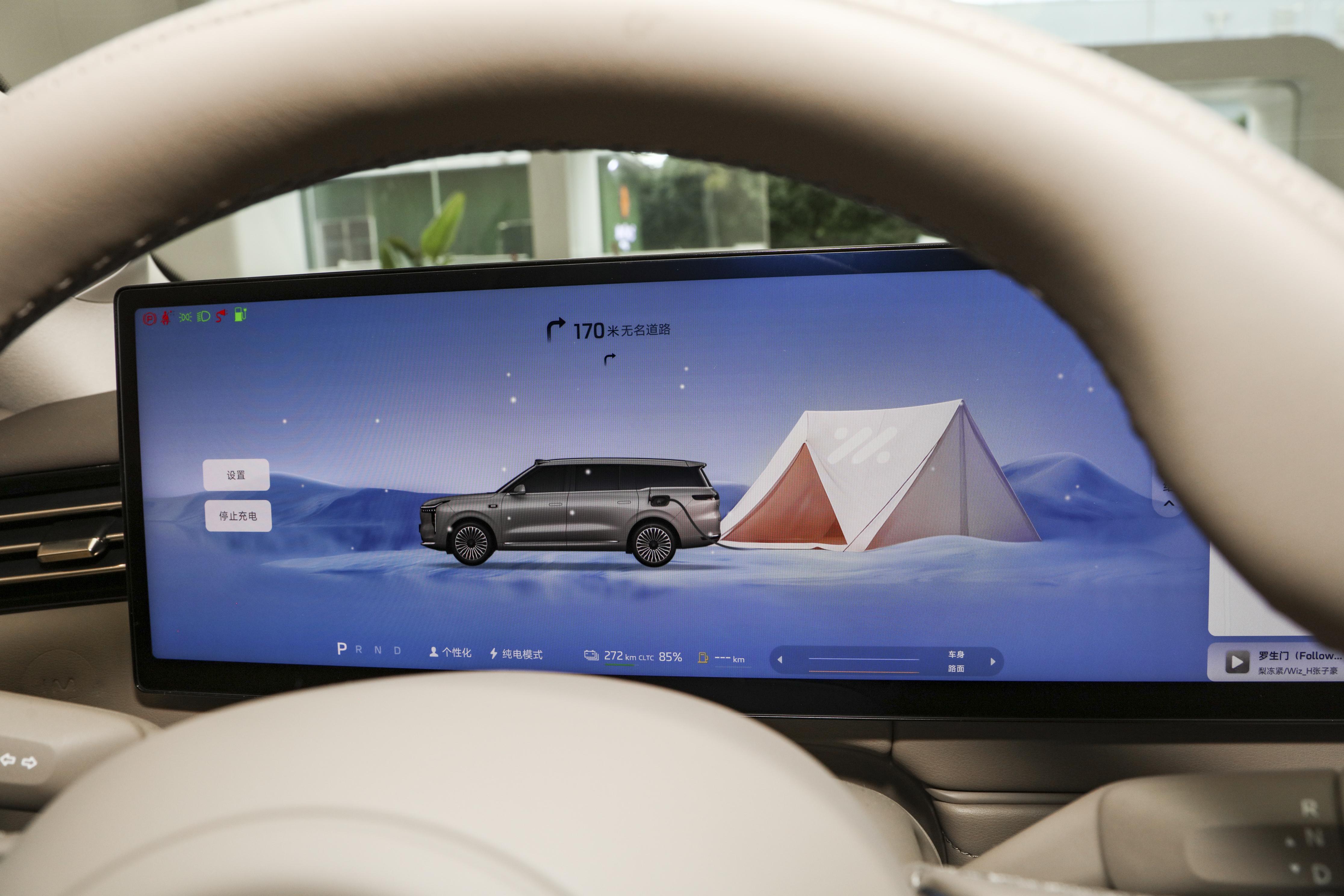 增程器介入時的靜謐性也值得點贊,二排噪音增量幾乎可以忽略不計,實際路況下的噪音水平爲34dB,與圖書館的安靜程度相當。再加上150mm雙腔空懸與CDC電控阻尼的配合,舒適模式下能夠有效過濾大部分碎石路面的顛簸,運動模式下過彎時的側傾也較 小。此外,爆胎穩定控制和矢量四驅系統的加持,無論是日常通勤還是偶爾行駛在複雜路面都可以輕鬆應對。