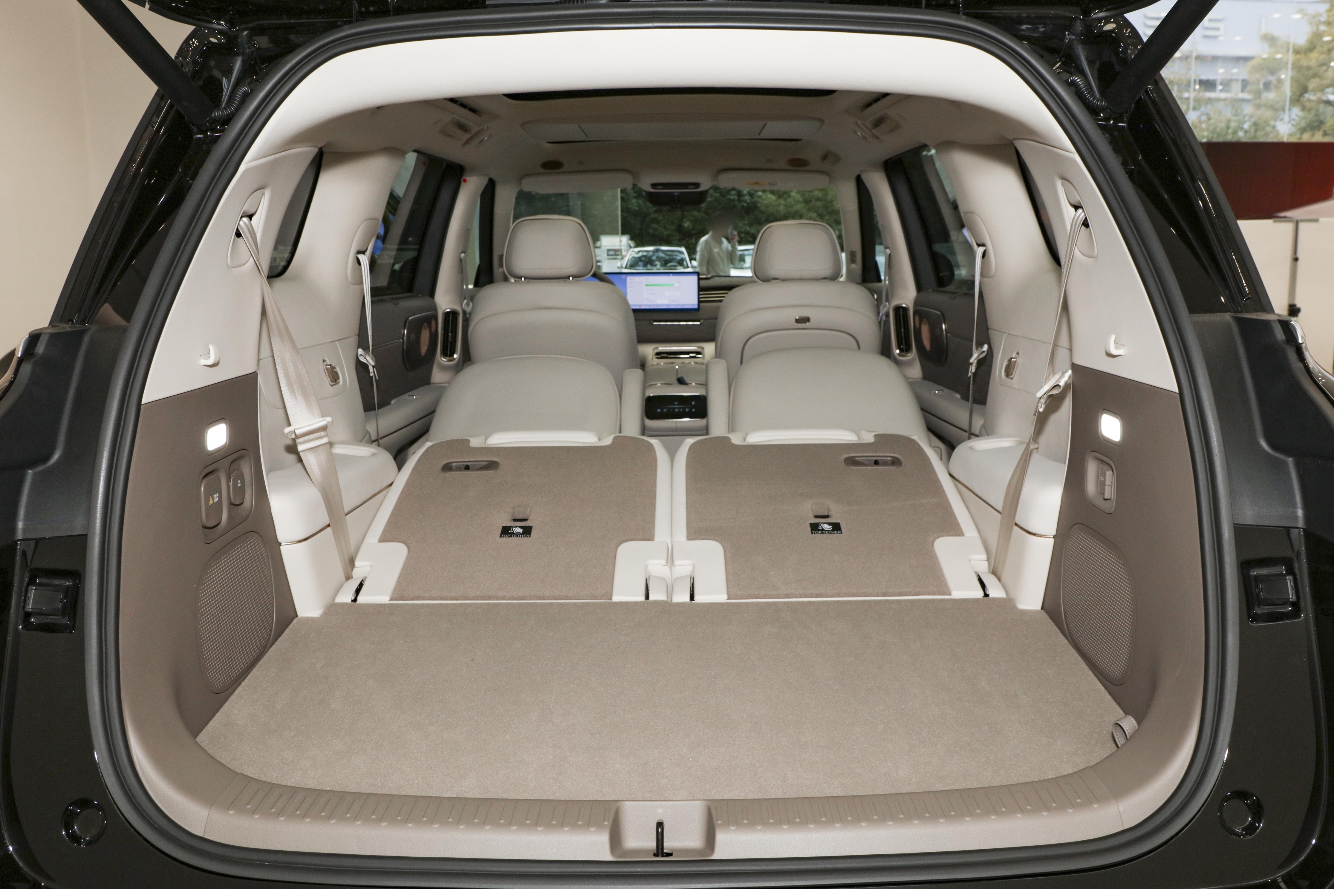 在看看車內儲物空間,規劃合理,後備箱暗藏12.3L雙開冷暖冰箱(支持-6℃-50℃溫控),前排扶手與二排均可取用。前門儲物槽可以放下大號保溫杯,中控臺下方開放式儲物箱可容納孩子玩具,二排隱藏式儲物袋方便隨手放置手機平板,滿足家庭出行的儲物需求。後備箱常規容積372L,在六座全開的情況下,還能容納兩個大號行李箱和一個嬰兒車。如果把第三排座椅放倒,那空間就非常可觀了,可擴展成近2米的純品達牀房,過年過家的年貨、行李箱都可以輕鬆容納。後備箱集成可拆卸水箱(支持加熱至50℃淋浴)、摺疊帳及220V電源,車尾燈組可化身露營照明燈,拓展戶外生活場景。