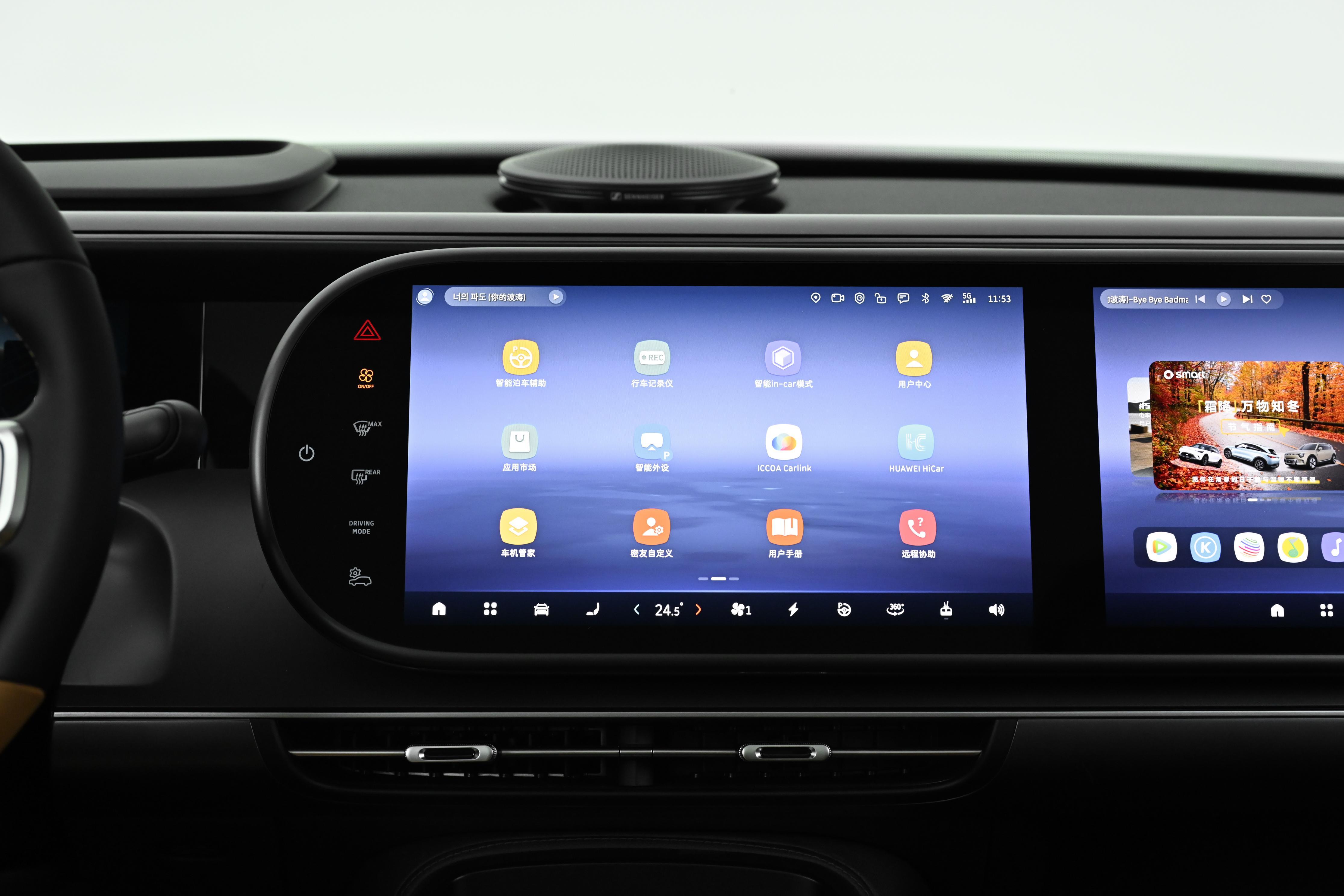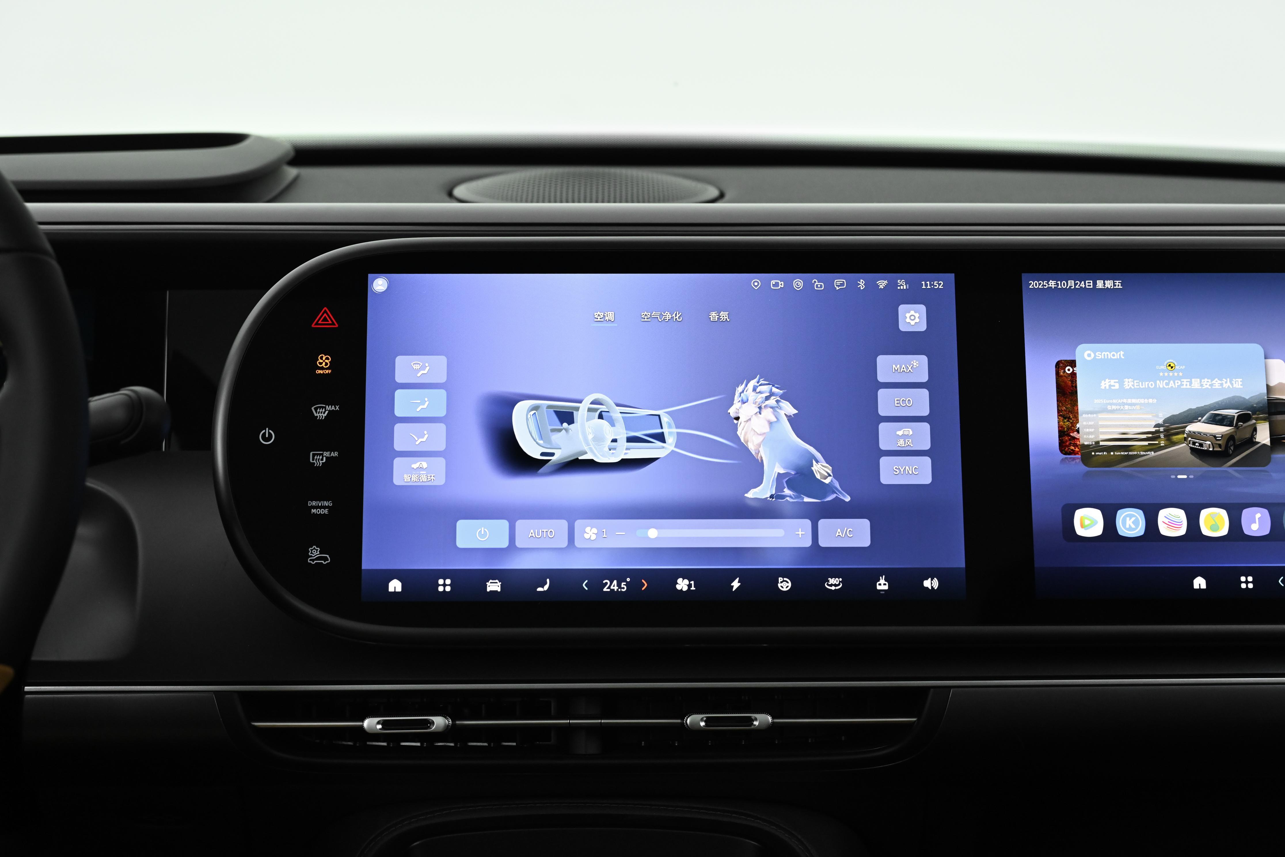 坐進駕駛艙,首先映入眼簾的是10.3英寸全液晶儀表、雙13英寸OLED屏和25.6英寸AR-HUD組成的“五屏互動”系統,科技感直接拉滿。OLED屏採用雙層Tandem技術,即使夏天中午陽光暴曬也不會出現反光,畫面比較清晰,各類信息一目瞭然。主駕全液晶儀表數據直觀,雙13英寸中控屏與副駕娛樂屏支持分屏操作,這樣副駕看電影、聽音樂絲毫不影響主駕,長途出行時副駕再也不會覺得無聊。