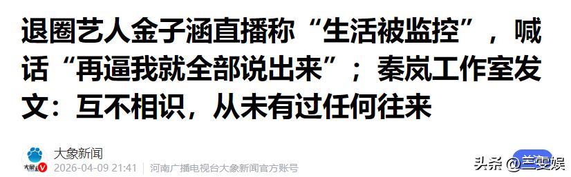大象新聞——退圈藝人金子涵直播稱“生活被監控”,喊話“再逼我就全部說出來”;秦嵐工作室發文:互不相識,從未有過任何往來