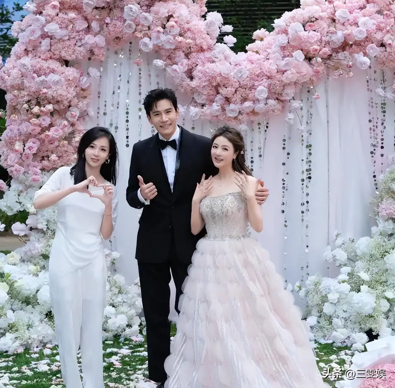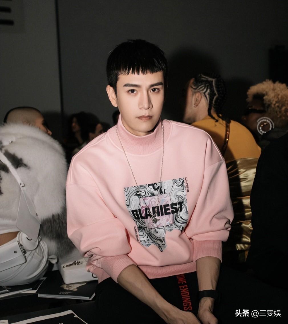 粉色玫瑰鋪滿現場,他穿着背後繡“軟飯硬喫”的白西裝。