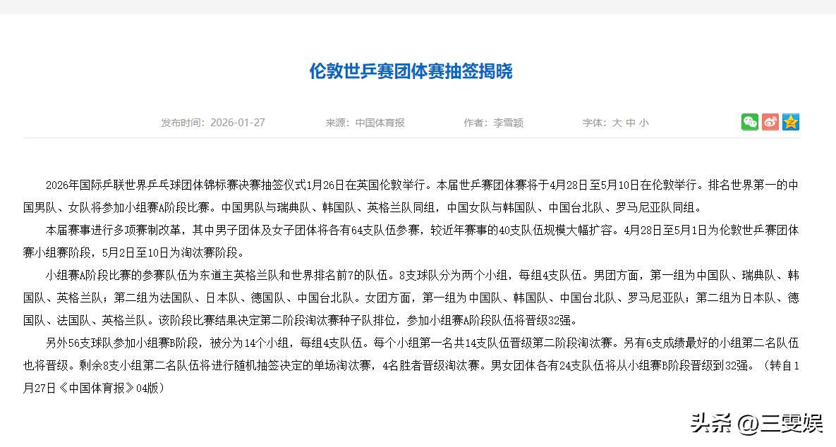 中國體育報——倫敦世乒賽團體賽抽籤揭曉