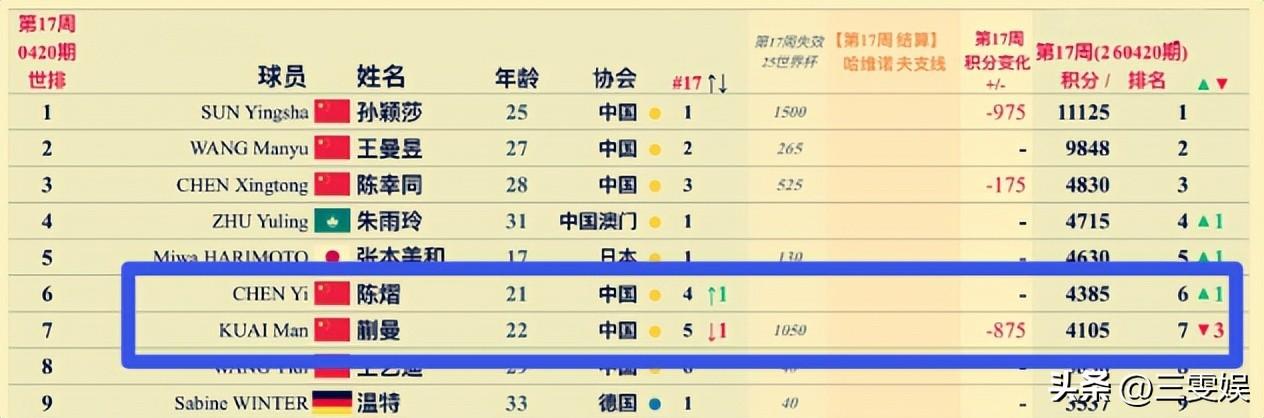 4月20號這期最新排名一出來,女隊那邊的蒯曼算是結結實實捱了一悶棍。