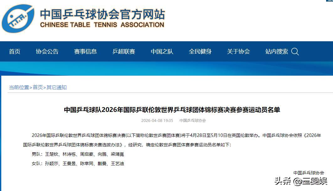 中國乒乓球協會——中國乒乓球隊2026年國際乒聯倫敦世界乒乓球團體錦標賽決賽參賽運動員名單