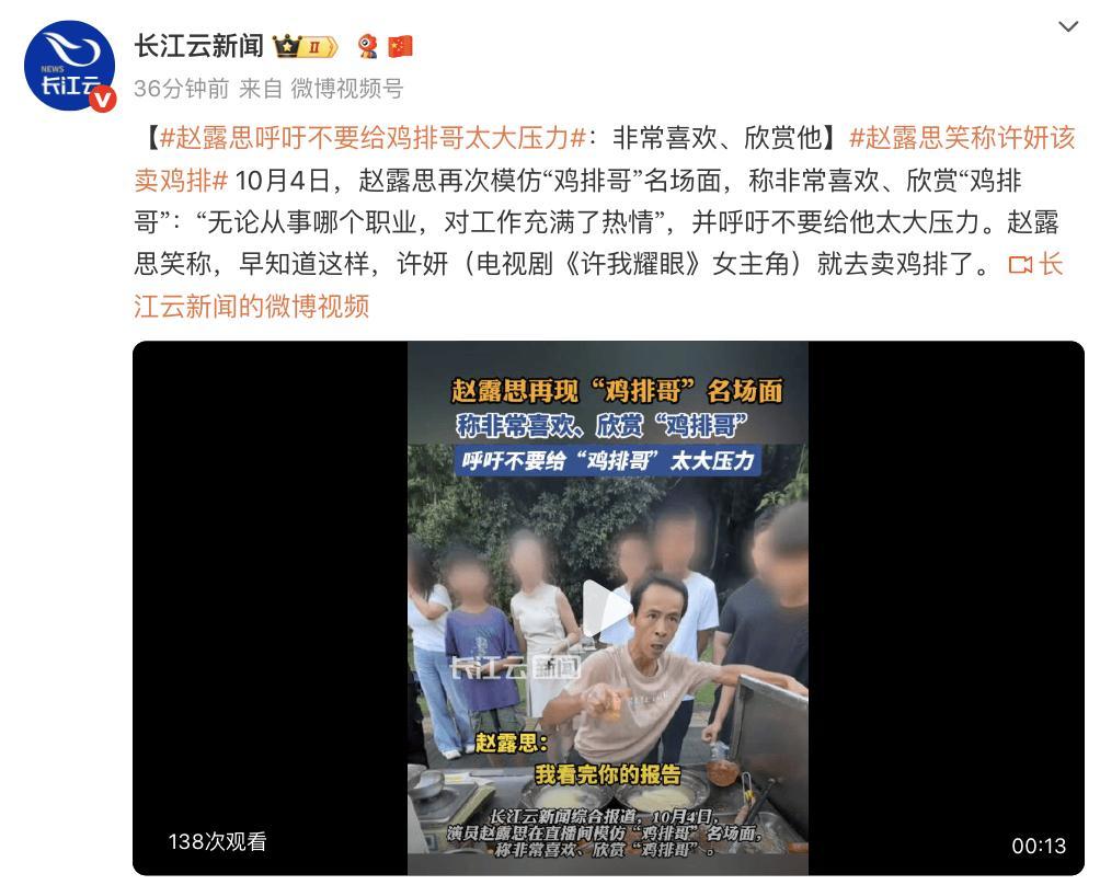 10月4日,趙露思再次模仿“雞排哥”名場面,稱非常喜歡、欣賞“雞排哥”:“無論從事哪個職業,對工作充滿了熱情”,並呼籲不要給他太大壓力。她說:“他身上有非常大的人格魅力,不要給他施加太大壓力了,他已經在他的行業裏做得非常好了。”