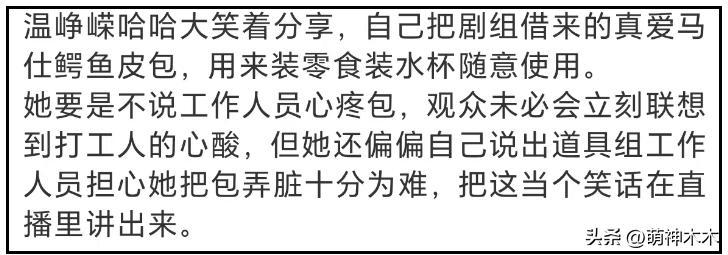 此外,溫崢嶸在宣傳新劇的時候,以調侃的口吻透露,自己用劇組借來的名牌包道具裝零食,讓工作人員很擔心,說完還哈哈大笑。她的做法也被指責沒有同理心,不考慮工作人員的處境。