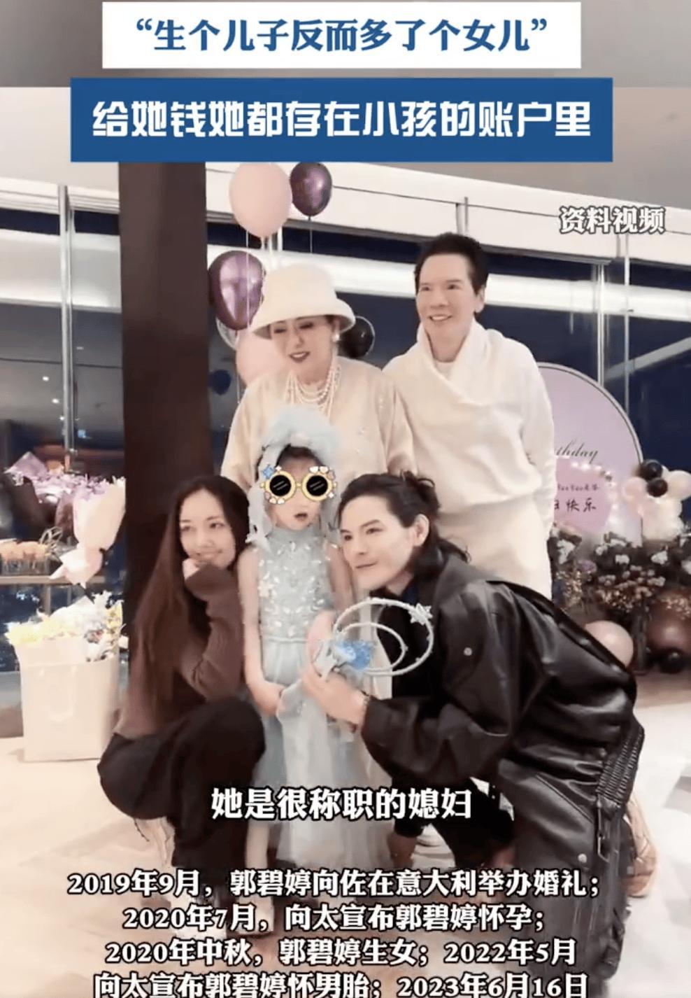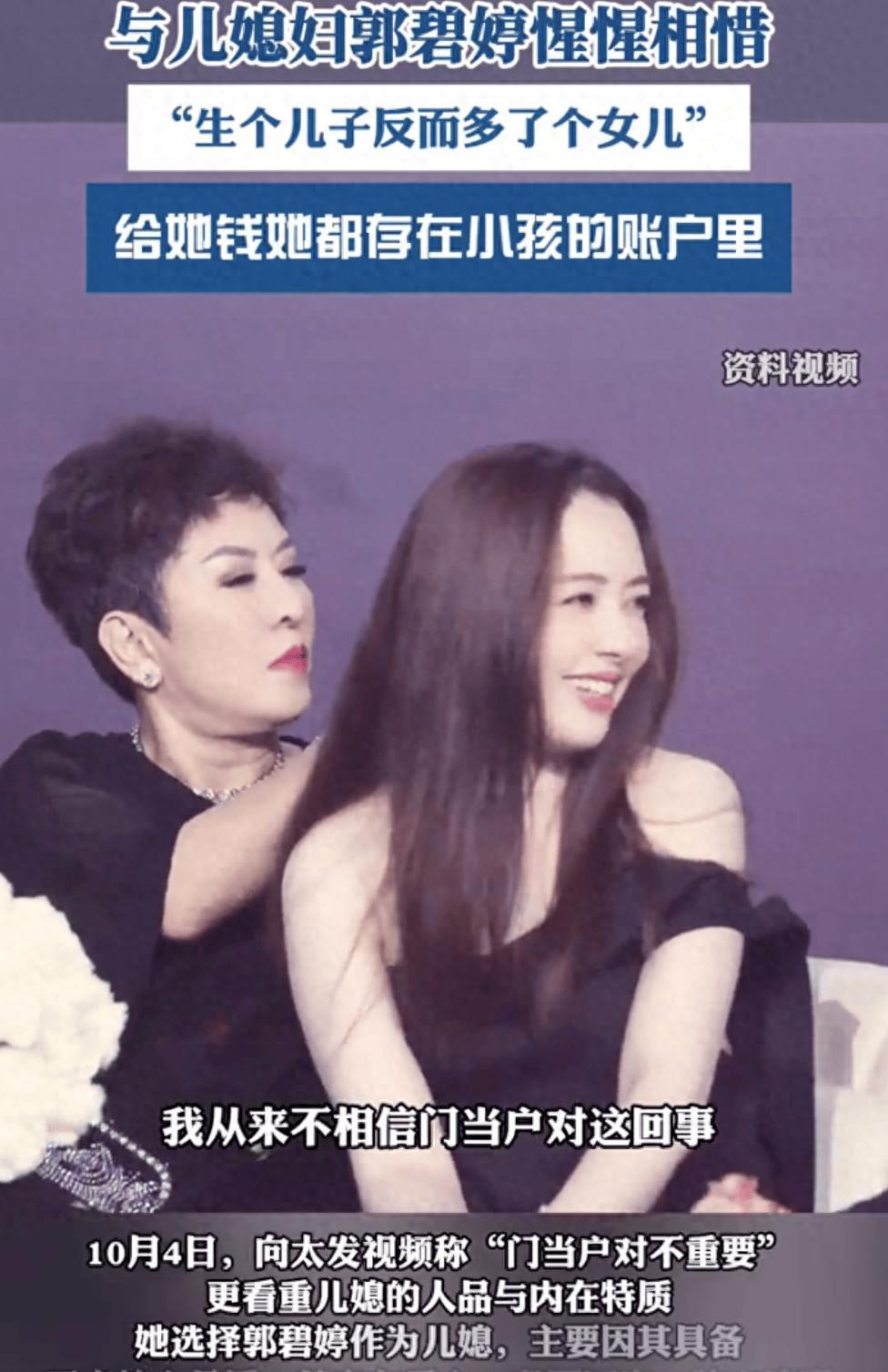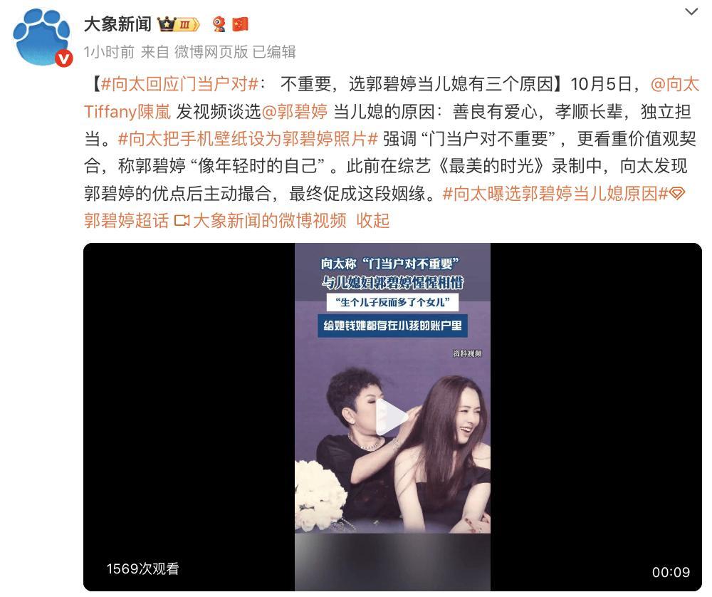 10月5日,向太陳嵐發視頻談選郭碧婷當兒媳的原因:善良有愛心,孝順長輩,獨立擔當。向太強調 “門當戶對不重要” ,更看重價值觀契合,稱郭碧婷 “像年輕時的自己” 。此前在綜藝《最美的時光》錄製中,向太發現郭碧婷的優點後主動撮合,最終促成這段姻緣。