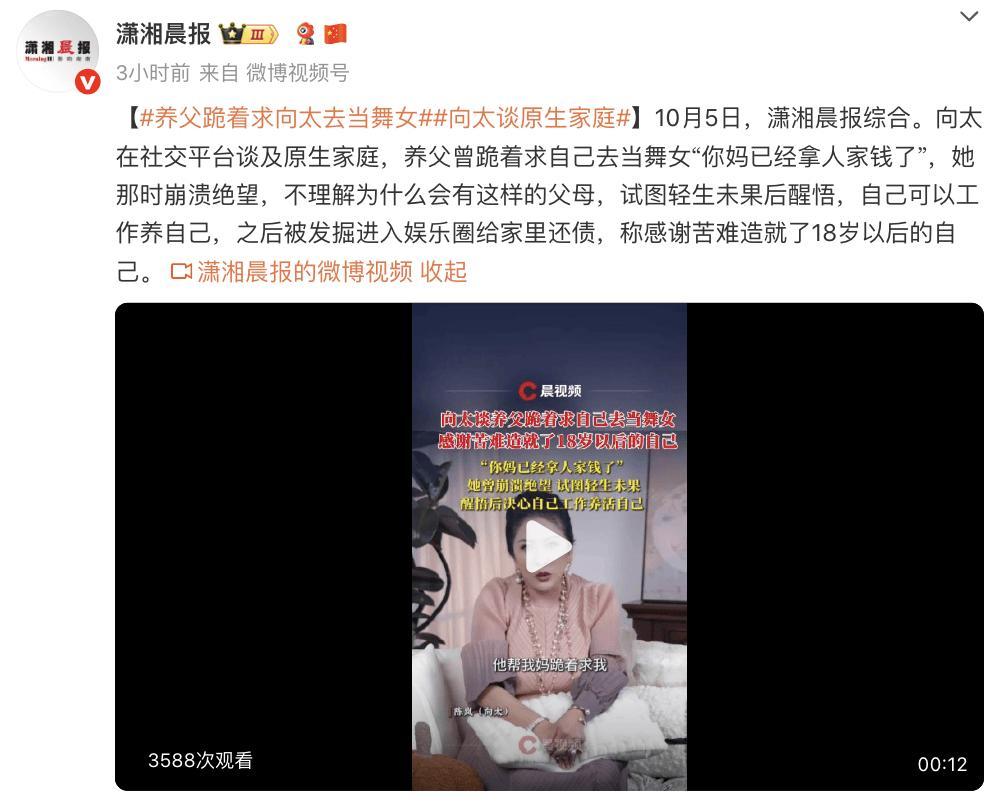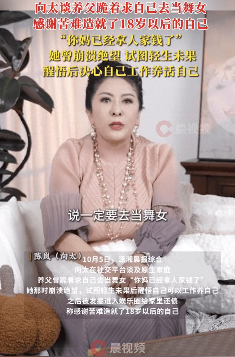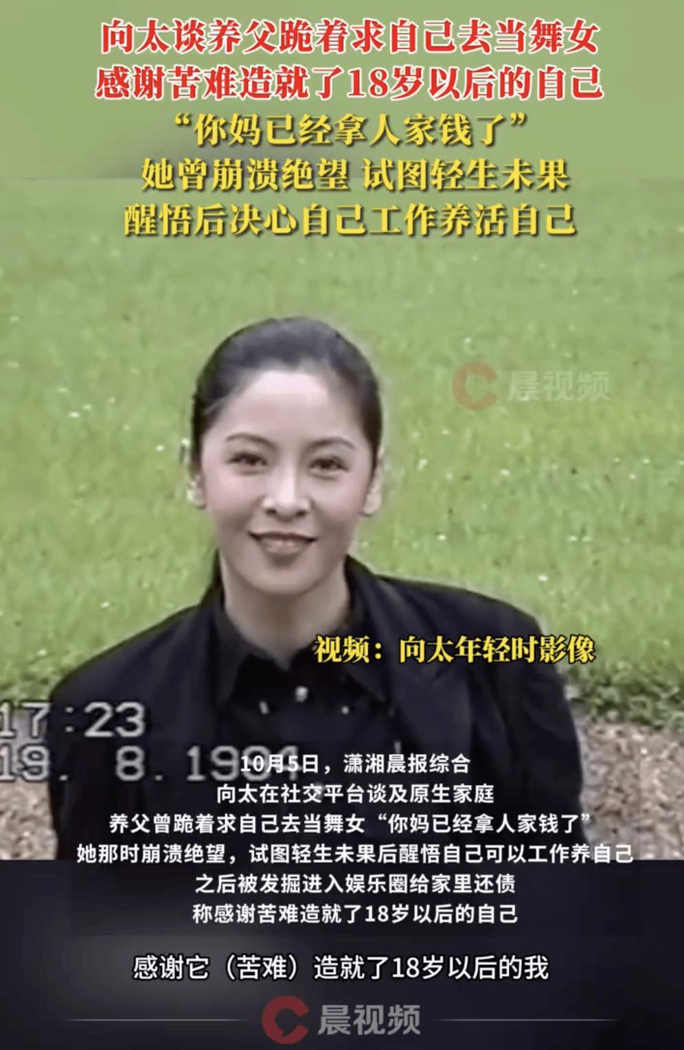 10月5日,瀟湘晨報綜合。向太在社交平臺談及原生家庭,養父曾跪着求自己去當舞女“你媽已經拿人家錢了”,她那時崩潰絕望,不理解爲什麼會有這樣的父母,試圖輕生未果後醒悟,自己可以工作養自己,之後被髮掘進入娛樂圈給家裏還債,稱感謝苦難造就了18歲以後的自己。