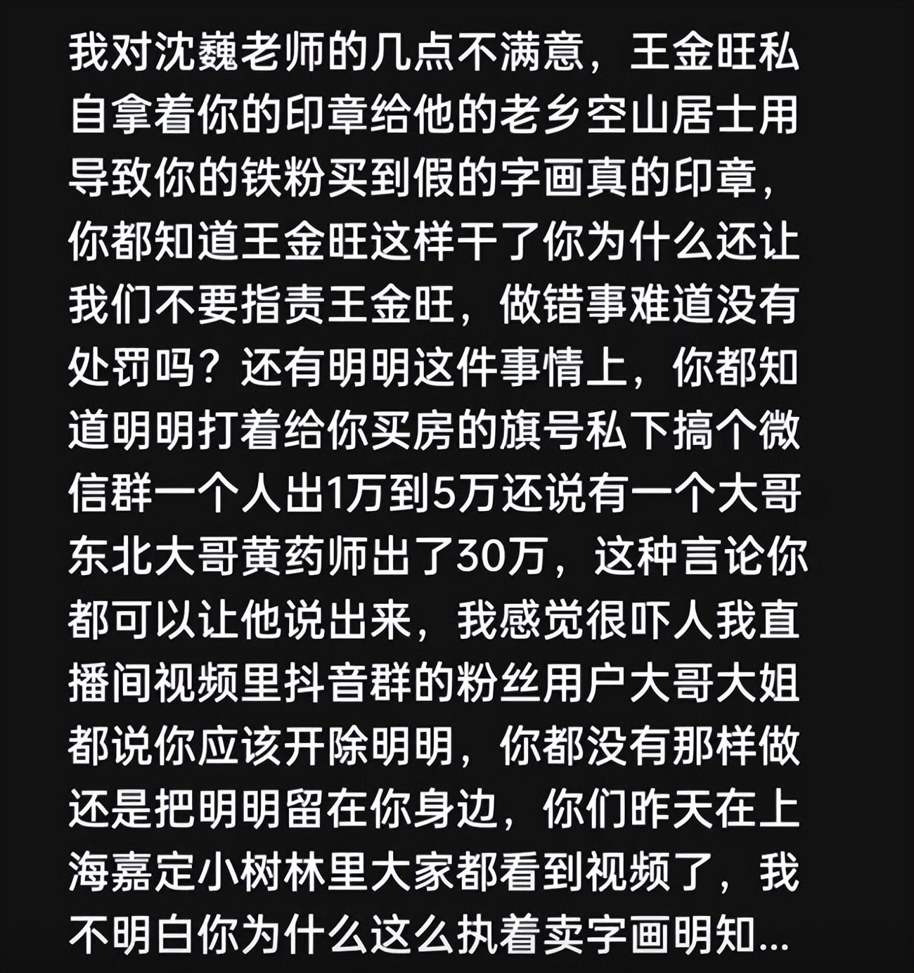 更讓沈魏生氣的是,一位追隨沈魏好久的網紅王某旺偷拿沈魏的印章,去給自己的老鄉用。最終讓沈魏粉絲買到了假的畫作,也就是畫是別人模仿沈魏作的,但印章是真的。沈魏身邊的另外一位網紅將此事曝光,並對沈魏在知道此事後不生氣表達不滿。