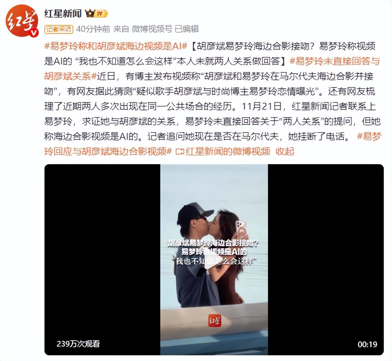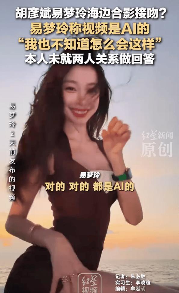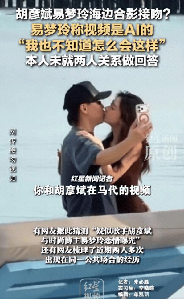 近日,有博主發佈視頻稱“胡彥斌和易夢玲在馬爾代夫海邊合影並接吻”,有網友據此猜測“疑似歌手胡彥斌與時尚博主易夢玲戀情曝光”。還有網友梳理了近期兩人多次出現在同一公共場合的經歷。11月21日,紅星新聞記者聯繫上易夢玲,求證她與胡彥斌的關係,易夢玲未直接回答關於“兩人關係”的提問,但她稱海邊合影視頻是AI的。記者追問她現在是否在馬爾代夫,她掛斷了電話。