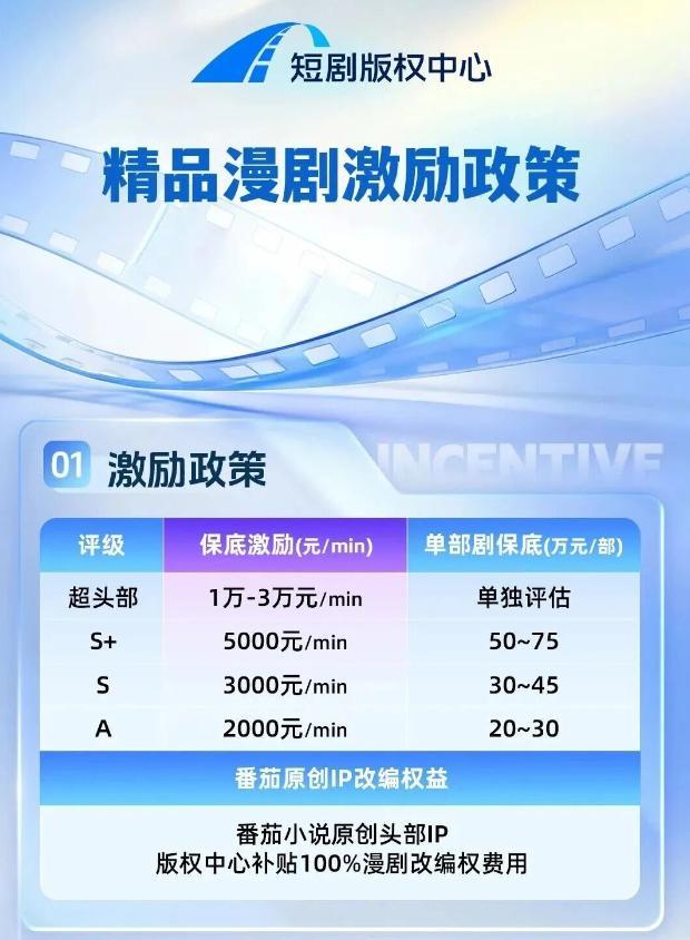 僅十天後,抖音再次發佈“精品漫劇激勵政策”,針對豎屏漫劇,最高能給超頭部漫劇3萬元一分鐘的保底激勵,按照一部漫劇100分鐘,超頭部的單部保底能到百萬以上。據瞭解,目前精品漫劇成本普遍在30萬左右,抖音直接的現金激勵政策無疑將會刺激更多創作者與其綁定。