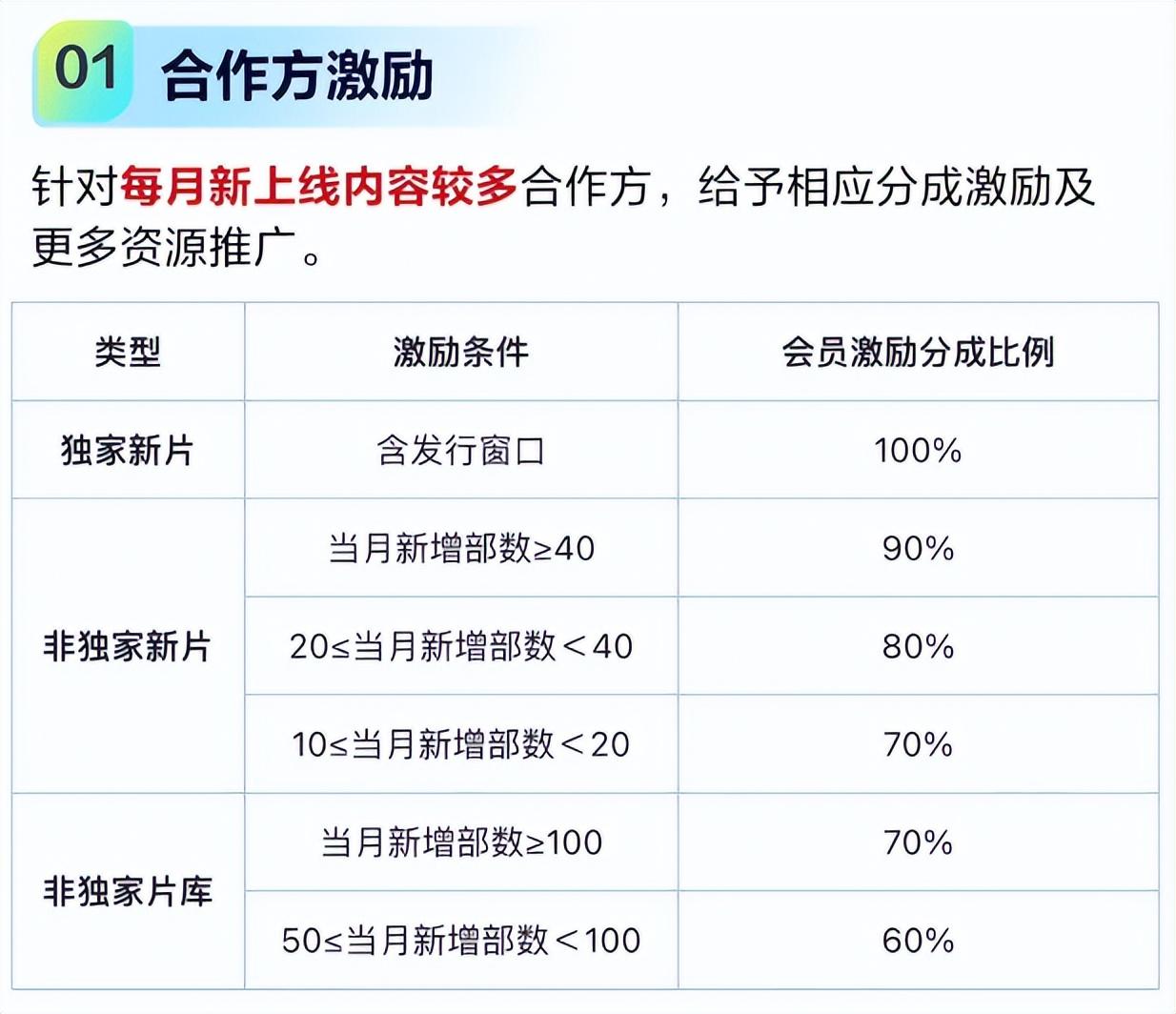 從合作計劃來看,目前愛奇藝屬於快速填充漫劇內容的階段,鼓勵合作方上線更多新片,部數越多分成比例越高。對於當月新增部數超過40部的合作方給予90%會員分成,獨家新片分成比例更高達100%。