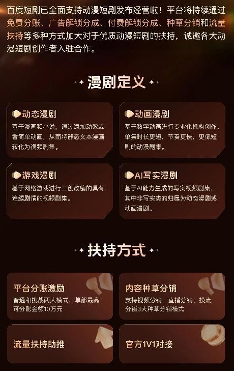 今年5月1日,百度發佈了“動漫短劇合作指南”,以平臺分賬激勵、內容分銷、流量扶持等方式扶持漫劇。7月,百度發佈“漫劇星躍計劃”,“度加”創作平臺對AI漫劇也有所扶持。