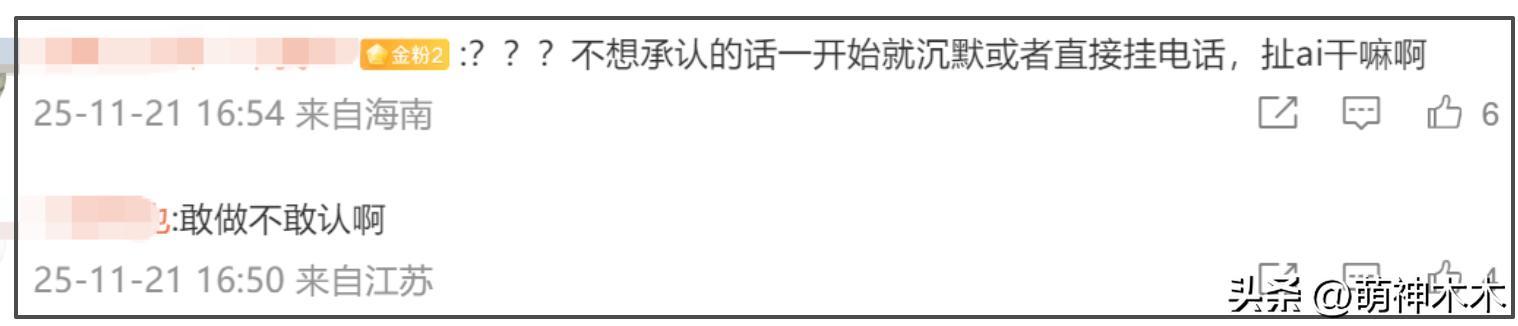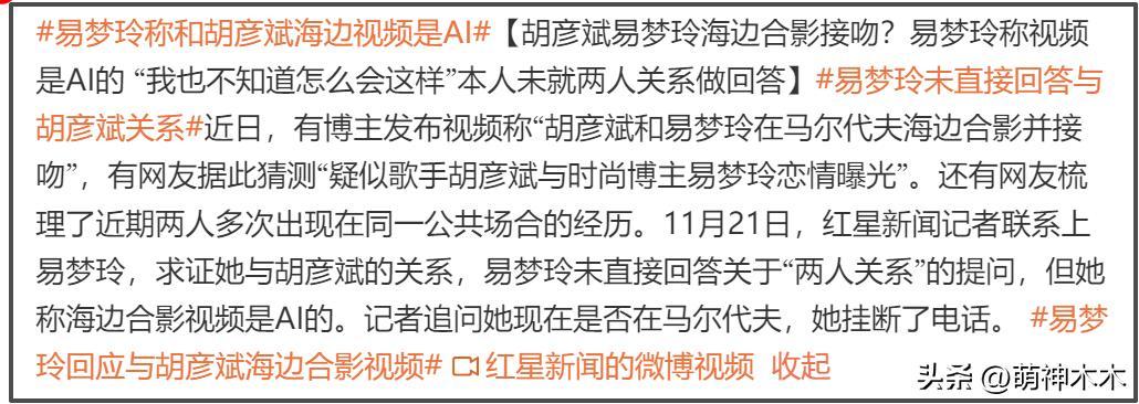 11月21日,有媒體詢問易夢玲,和胡彥斌在海邊接吻的視頻,她回應稱那個視頻是AI的,自己也不知道怎麼會這樣,還稱好好笑。記者還追問她現在跟胡彥斌的關係,以及是否在馬爾代夫,她拒絕回應,直接掛斷了電話。