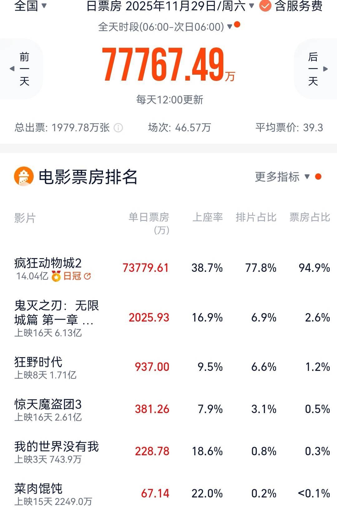搜狐娛樂訊 (哈麥/文)11月26日(週三),迪士尼動畫續作《瘋狂動物城2》上映,首日票房2.28億元,上座率14.9%,次日票房1.44億元,上座率9.1%。第三日票房2.83億元,上座率17%。