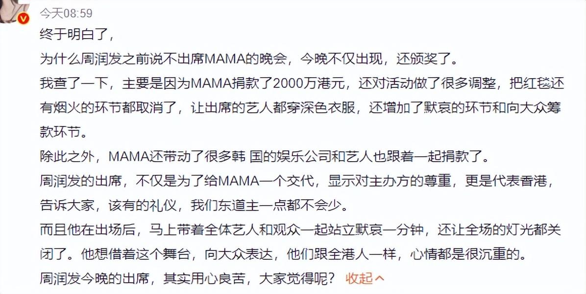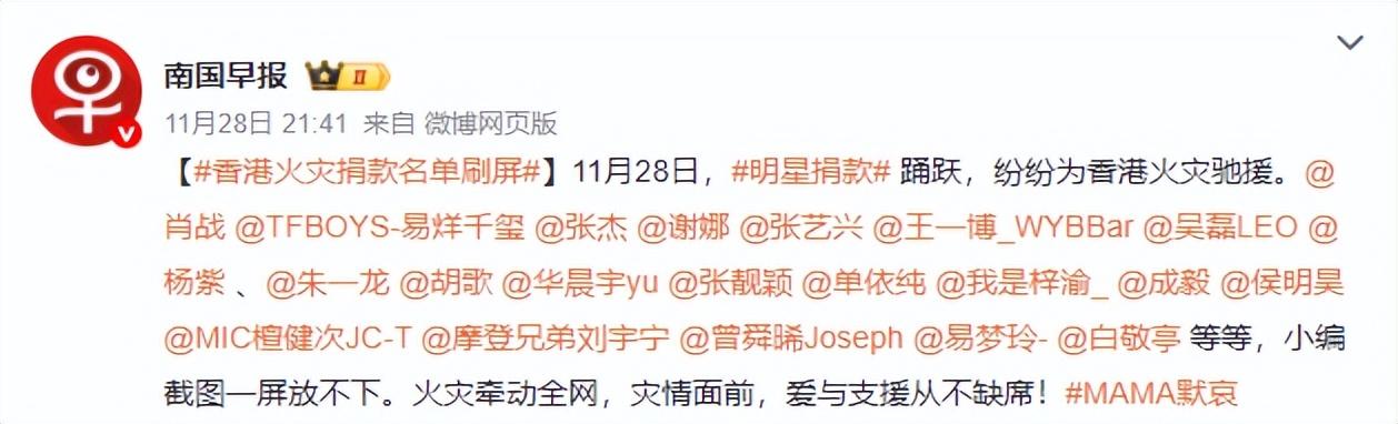 香港大火發生後,MAMA主辦方捐出了2000萬港元,還帶動了韓國SM、YG娛樂公司和旗下藝人們紛紛捐款。