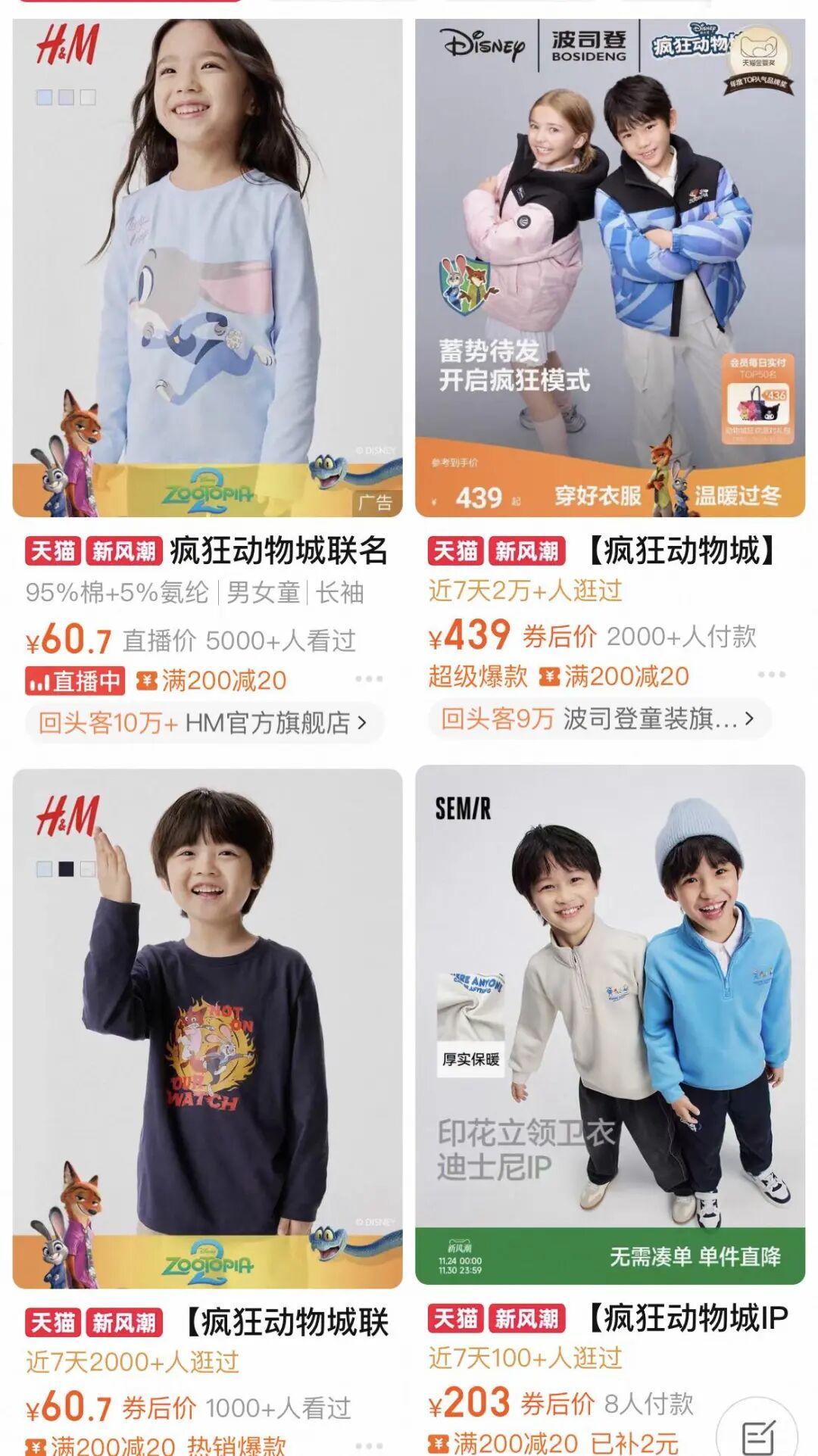 在餐飲之外,與《瘋狂動物城》聯名最密集的是鞋服飾品賽道的品牌。與以往的IP聯名不太一樣,鞋服領域的聯名產品不再侷限於成人款消費,H&M、森馬還專門做了童裝系列,售價通常在100~500元之間。