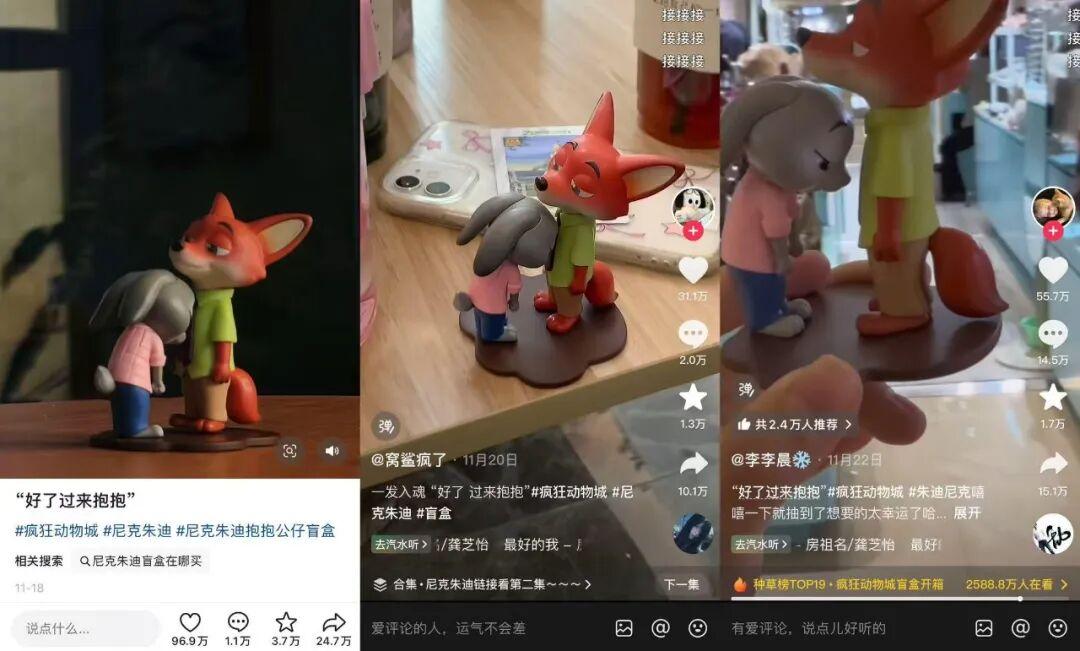 “最佳拍檔”在社交媒體上也引起了廣泛討論。網友抽中“過來抱抱”場面對應的盲盒的好幾個短視頻,在抖音上破了30w贊,最高達到近100w贊。