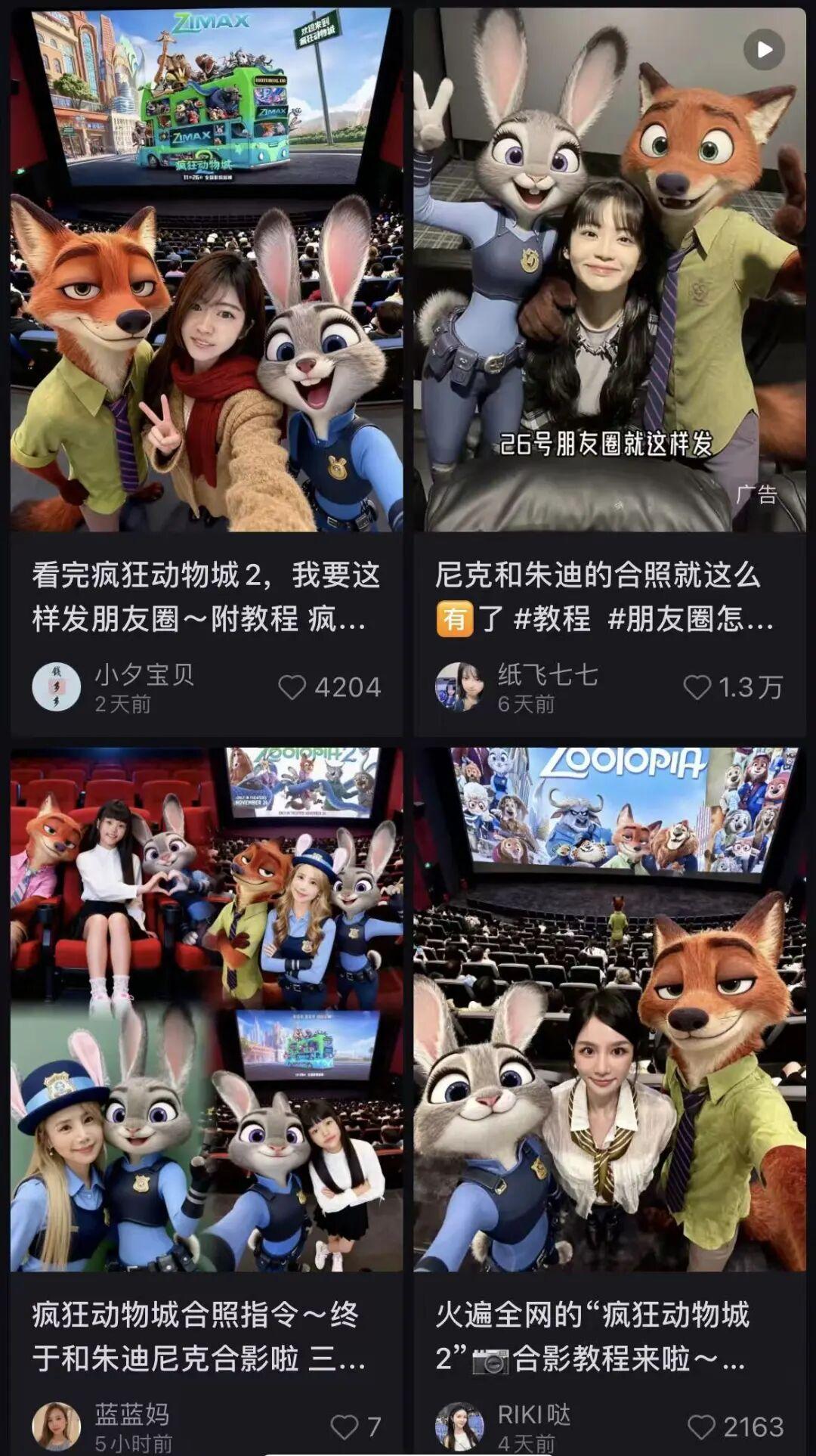 最典型的是在小紅書、抖音、朋友圈等刷屏的AI合拍打卡:小紅書上一條“瘋狂動物城AI合拍”教程最高獲1.2萬贊。#瘋狂動物城 話題下,跟風打卡的帖子,涵蓋穿搭、妝容、探店等場景。爲了能拍一張打卡照,許多人走進了電影院。