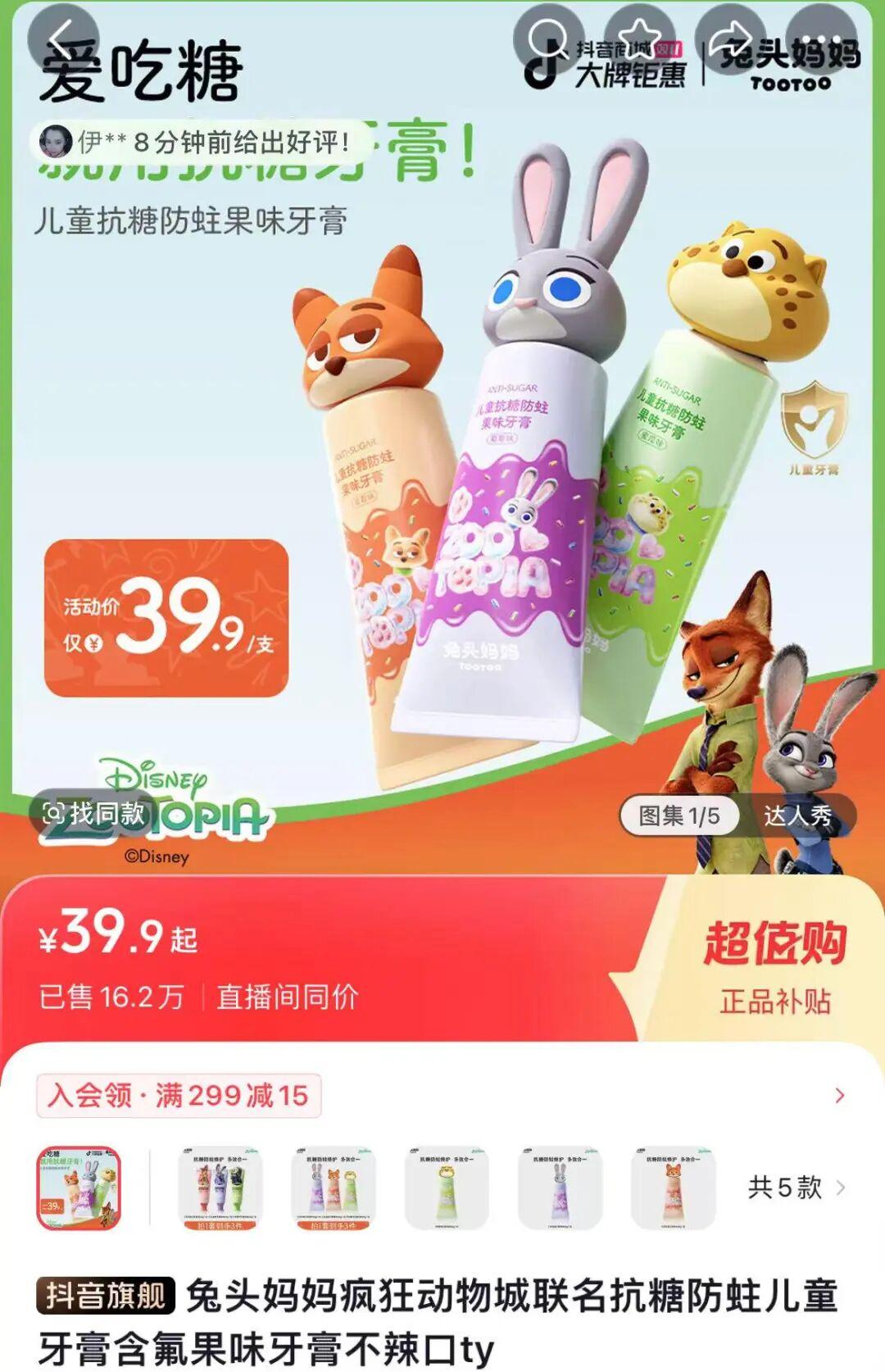 但小尺碼的狐兔印花T恤、衛衣等仍然成了童裝的熱門,其中,波司登聯名的兒童羽絨服淘寶單店銷售量突破2000單,與兔頭媽媽聯名的兒童牙膏在抖音單店銷量超16萬筆;這足以證明《瘋狂動物城》既能收割年輕人,也能夠收割家長消費。