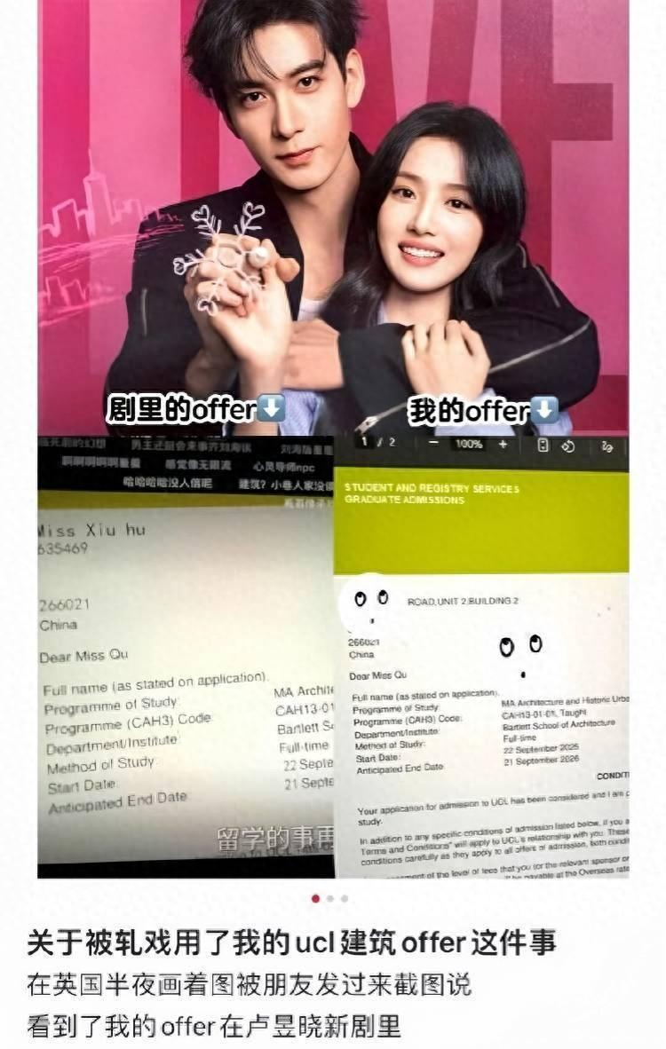 劇集開播後不久就有素人博主爆料,劇中出現的倫敦大學學院(UCL)建築系錄取通知書,正是其女友的真實文件,劇組僅粗糙修改標題的姓名拼音,但正文內容中卻完整保留了家庭地址、郵編等敏感信息,甚至殘留原姓氏未完全覆蓋。