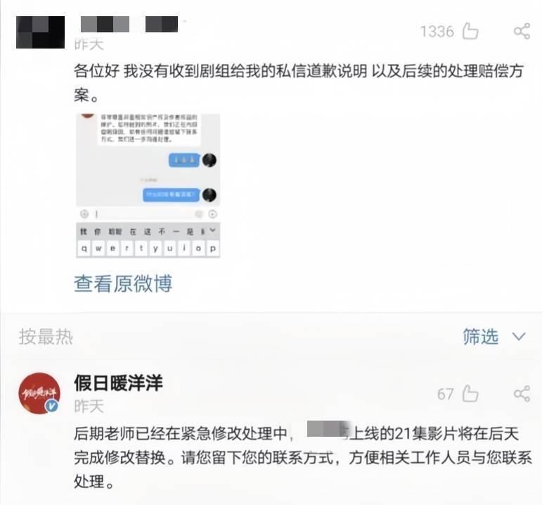 電視劇《假日暖洋洋》將網友父母照片當作“遺照”使用,劇組首次發佈道歉信後,還爆出其根本未聯繫當事人私信道歉,更沒有賠償方案;隨後還有網友在留言區貼圖投訴,該劇也使用了她的照片,還P圖給她紋了身,而後面這位網友沒有得到任何道歉。