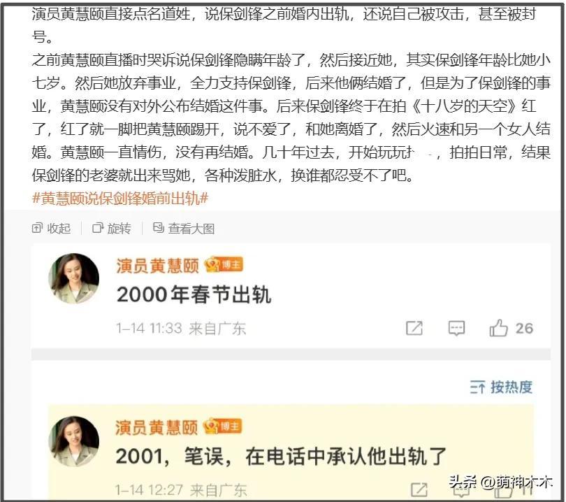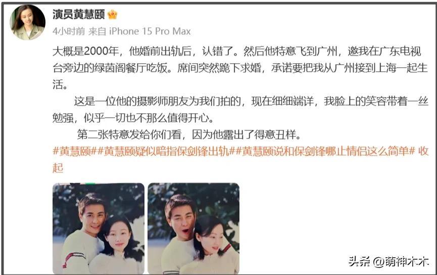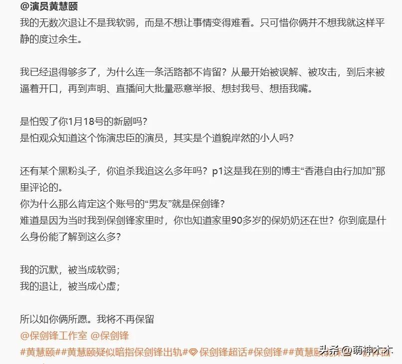 最近指控保劍鋒隱婚出軌的女演員黃慧頤再次發文,哀訴自己被逼到沒生路,直言自己不再保留,終於站出來手撕保劍鋒了。