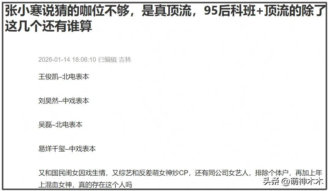狗仔給出了幾個關鍵信息——科班出身和國民閨女A因戲生情、綜藝捆綁反差萌女星B、95後小花C和他籤同一個公司、戀上混血年上姐D。