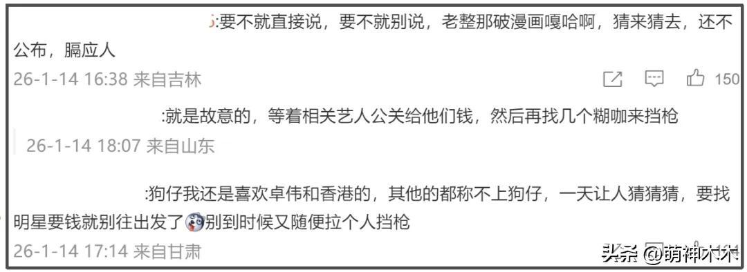 網友猜來猜去發現狗仔的爆料看似詳細,但指向性並不明顯,隨便扒一扒就能有幾個男星“入圍”,搞得網友在評論區吐槽,要是想爆料就直接爆,這種謎語瓜看着就像是等着明星公關找上門要錢的一樣。