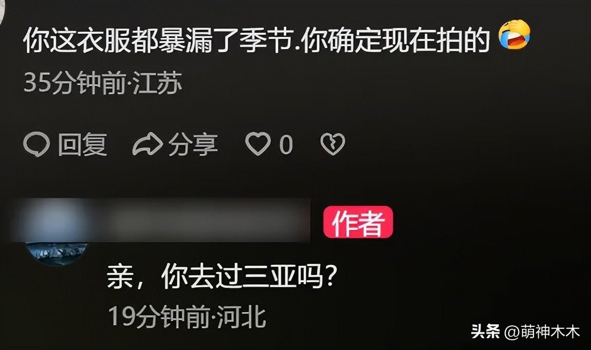 有網友質疑偶遇片段並非近期,畫面裏還有人穿着短袖,博主則暗示閆學晶去了三亞,穿得少也正常。