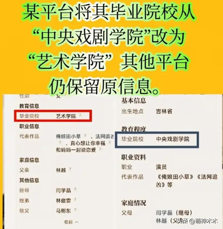 除此之外,閆學晶繼女林傲雪和侄子閆浩博也被曝是中戲畢業,其中繼女林傲雪此前資料顯示是中戲畢業,結果發酵之後立馬就改成了藝術院校畢業,具體哪個學校也沒說,這麼怕被討論?
