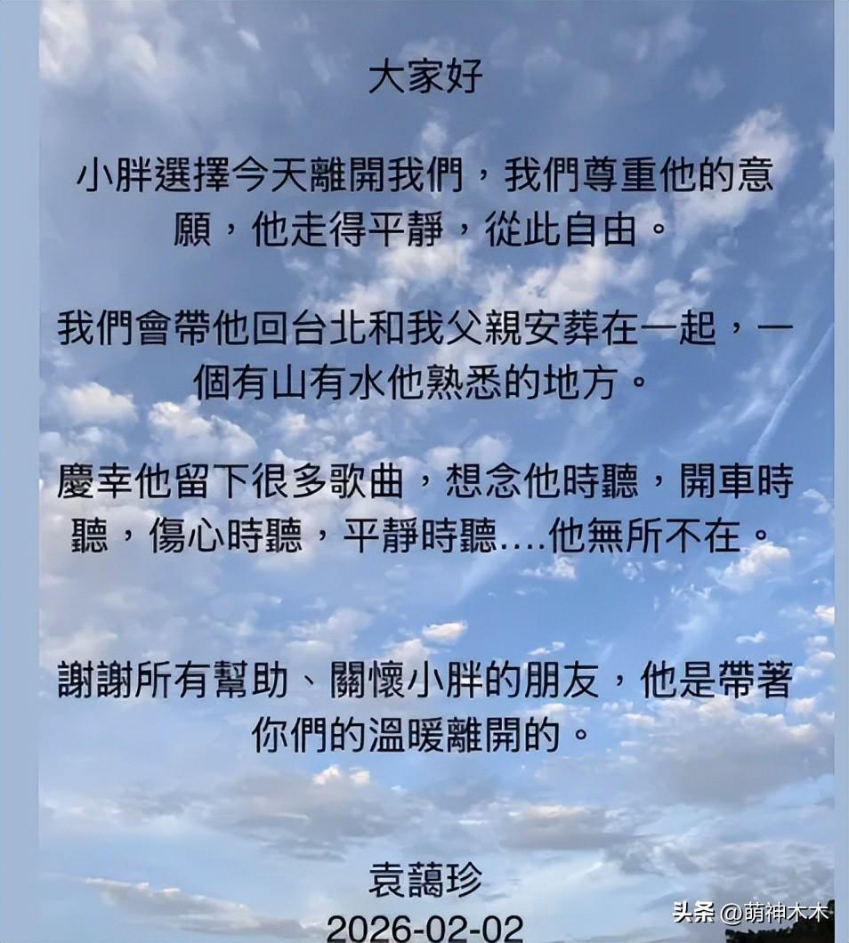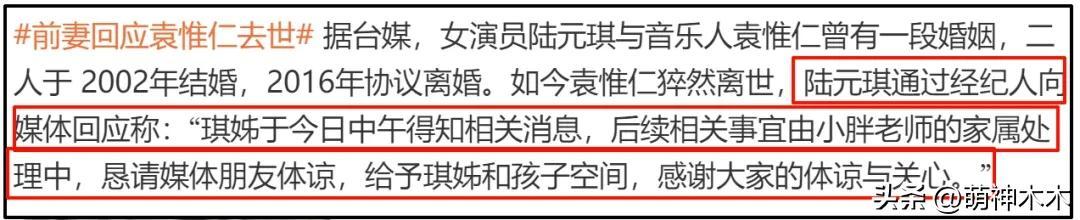 另外,袁惟仁前妻陸元琪也透過經紀人回應了,讓大家給予家屬和孩子空間,後續相關事宜小胖老師家人會處理,感謝大家體諒和關心。