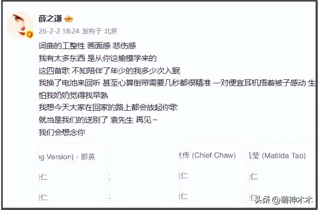薛之謙曬出袁惟仁四首代表作表達自己的喜愛之情,稱它們陪伴了自己的少年時光,而自己則從袁惟仁那偷摸學到了很多,比如詞曲工整、畫面感等,而他的送別方式就是回家的時候再次播放袁惟仁的歌,並表示會永遠想念他。