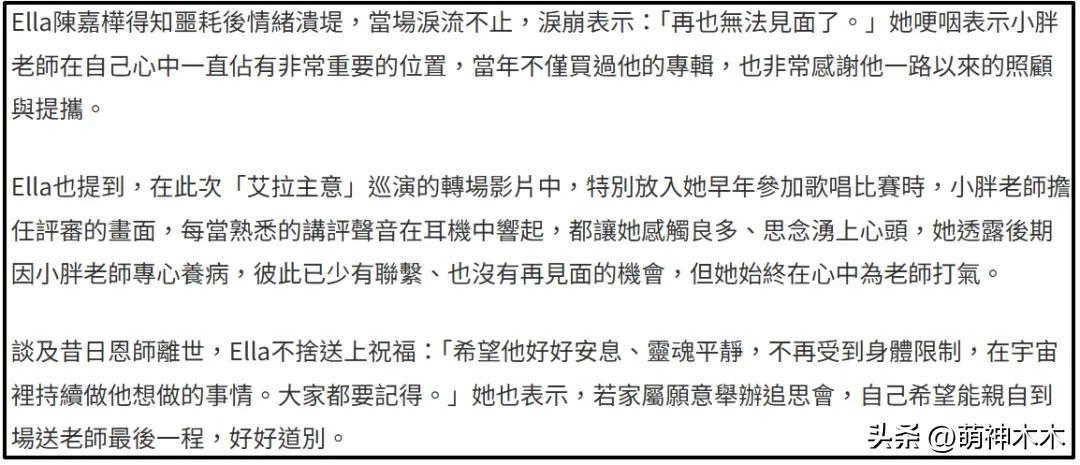 Ella知道袁惟仁去世後情緒崩潰落淚,哽咽表示無法再見面了,稱小胖老師對她很重要,一路以來受到很多照顧和鼓勵,希望小胖老師好好安息,靈魂不再受到身體限制,如果家屬願意舉辦追思會,自己會去送最後一程,好好告別。