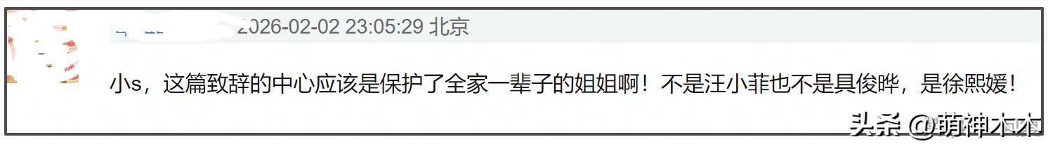 不止把孩子排除在外,S家一直在給具俊曄立深情人設,小S的致辭更是分分鐘離不開姐夫,關於大S一生的成就,以及對家庭的付出,對許多人的幫助和善舉,絲毫沒有提及,只是不斷提具俊曄帶給大S的溫暖和深情,隱隱約約還在拉踩前姐夫汪小菲。