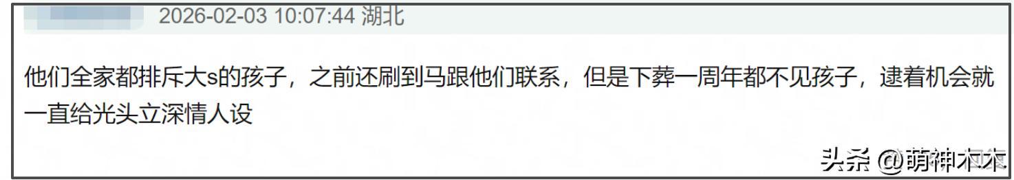 大S下葬時S家就沒有通知孩子,現在一週年也沒有通知,不止一位網友發現,S家似乎有意無意地將大S子女排除在外,小S和S媽一直口口聲聲說在乎大S,非常想念她,但對於大S最愛的兩個孩子,卻沒有人提及和在意,親媽的所有悼念都把孩子完全排除,令人難以理解。