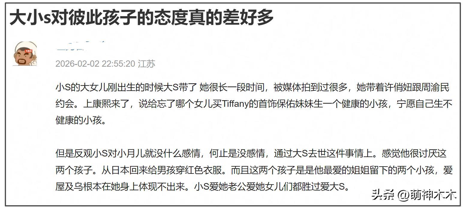 只能說,希望S家以後多多關心一下大S的子女吧,畢竟她最在乎的就是孩子,實實在在的關心,比什麼都重要。畢竟孩子纔是大S留在世上的唯一骨血。