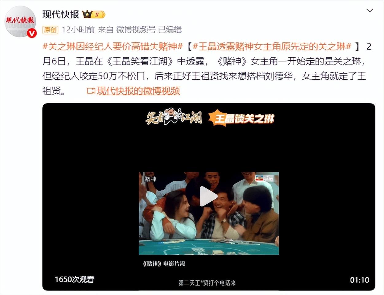 王晶說:“她當時的經紀人是梁李少霞,向華勝就打電話給梁李少霞說,找關之琳拍《賭神》搭劉德華,她經紀人就死咬着‘我要50萬’。第二天,王祖賢打電話來,‘我想拍你這部戲,我想搭華仔,我沒有搭過華仔,錢隨便你給。’所以就變成王祖賢咯,然後後來我見到關之琳,我就說不好意思,我是提名你的,就沒了,她說‘對啊,我睡一覺醒來就沒了一部戲了’。”