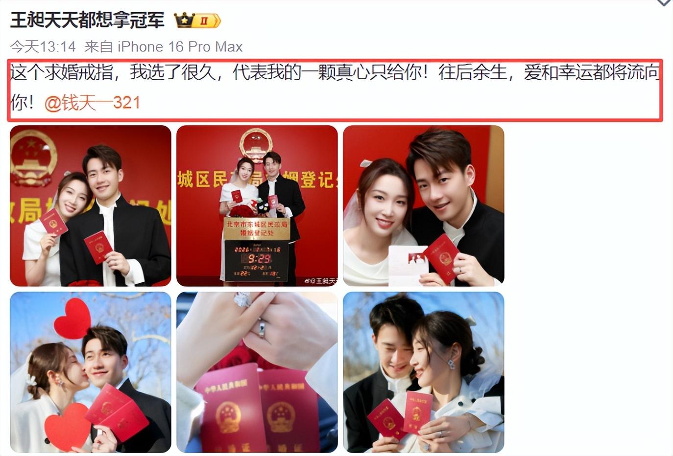 而錢天一則在同一時間發文這樣寫道,自己在生日時的願望就是嫁給王昶,一睜眼就實現了。同時她發佈了一段王昶向自己求婚的視頻。