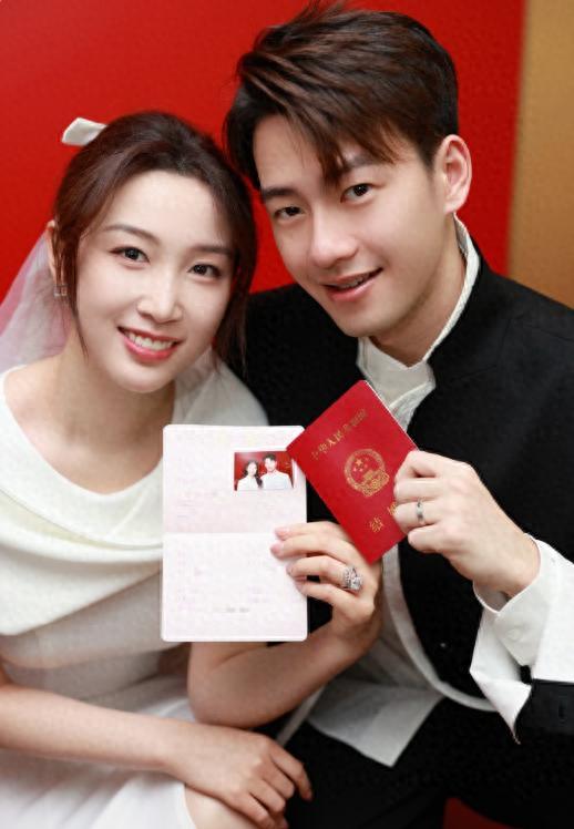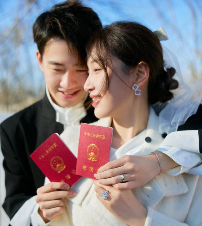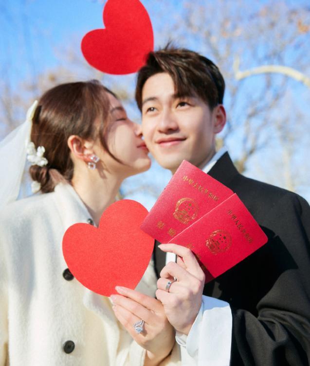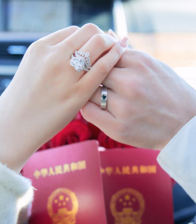 還配上了兩人在民政局領證的照片,其中一張照片中兩人精心打扮,男帥女美,各自手拿結婚證,面對鏡頭露出幸福的笑。