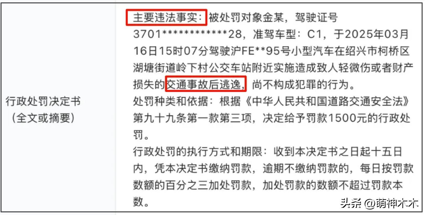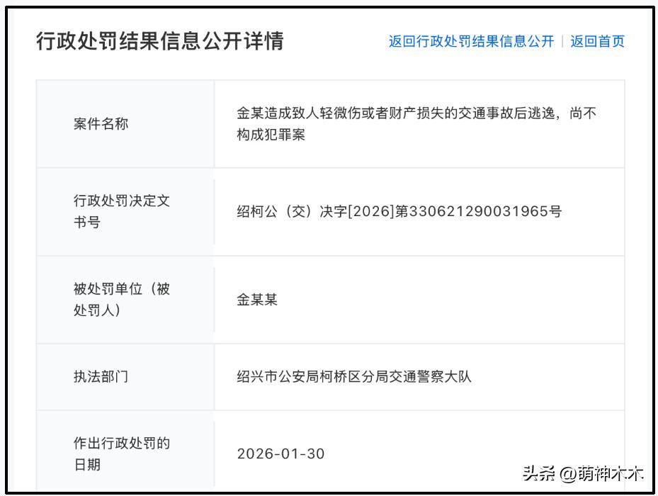 金晨肇事逃逸的處罰曝光,狗仔曬出金晨的處罰結果,造成致人輕微傷或者財產損失的交通事故後逃逸,罰款1500元,徹底成了違法藝人!