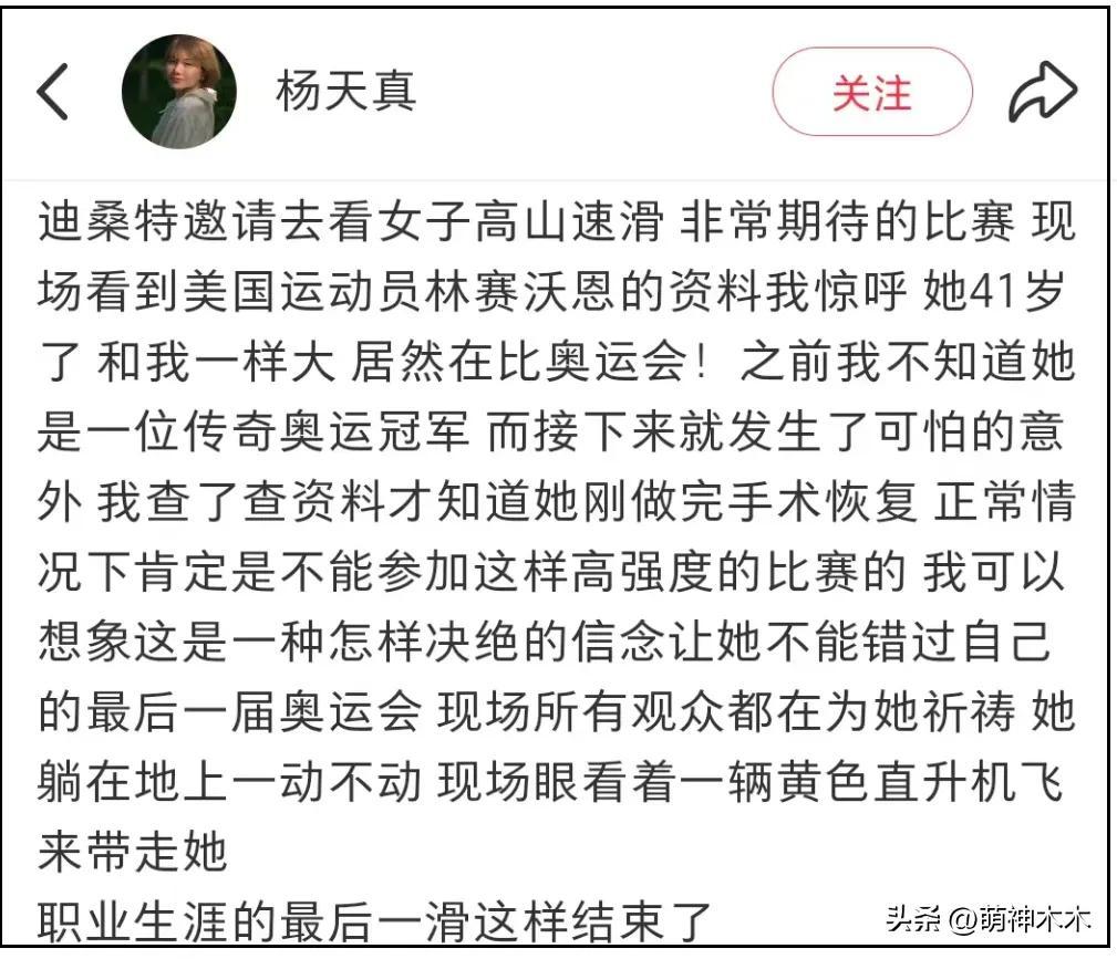 最近第二十五屆冬季奧林匹克運動會在意大利米蘭如火如荼舉行,知名業內楊天真在現場觀看了比賽,目睹41歲高山速滑運動員林賽·沃恩重傷下場,並把事故現場分享到了社媒之上,很快引發爭議。