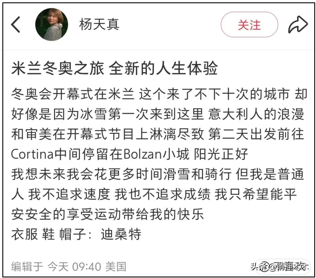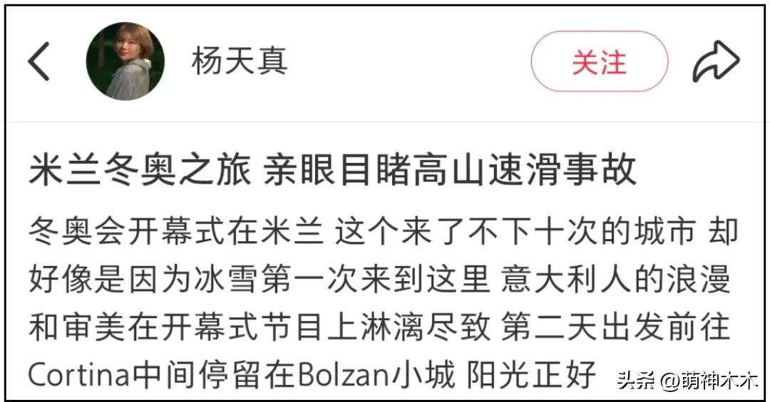 只見楊天真社媒動態標題直接就寫着“米蘭冬奧之旅,親眼目睹高山速滑事故”,還配了一大段長文和多張live圖。