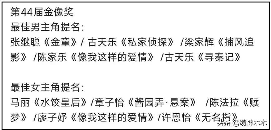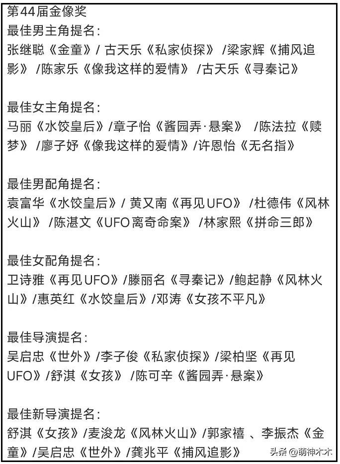 這裏放上金像獎完整提名名單吧,從金雞獎到金像獎,楊冪和趙麗穎再次雙雙掉提了,誰也沒能入圍。