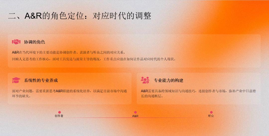 目前爲止,所有這些現象,這又回到了我剛剛提到的A&R角色。如今的A&R已經遠不只是音樂製作層面的溝通,它更包括與媒體溝通、與創作者溝通、與表演者溝通、與平臺溝通,甚至與投資者、金主溝通。它正在變成一個連接一切的中樞。