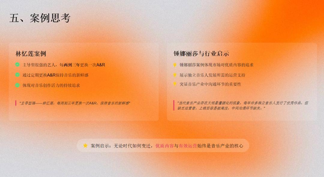 永遠要懂得長遠的看,知道好的作品在哪裏,好的音樂人在哪裏,如何讓好的音樂人持續的有正向的創作,怎麼讓好的音樂表演者有一些越來越優質的表演。這些例子我特別要提的在我合作過的林憶蓮,她每隔幾年就換音樂合作伙伴,都是一些很有A&R思考者與她合作,這就讓一個很好的表演者有一直有好作品的可能性。如果是產業者,你也要思考,有A&R思維的管理者爲你去經營這個平臺。那當然好的藝人你身邊一定要有一個可以說服你,你信任的好的A&R合作伴侶,這是我這次最後我的要講的一個核心。