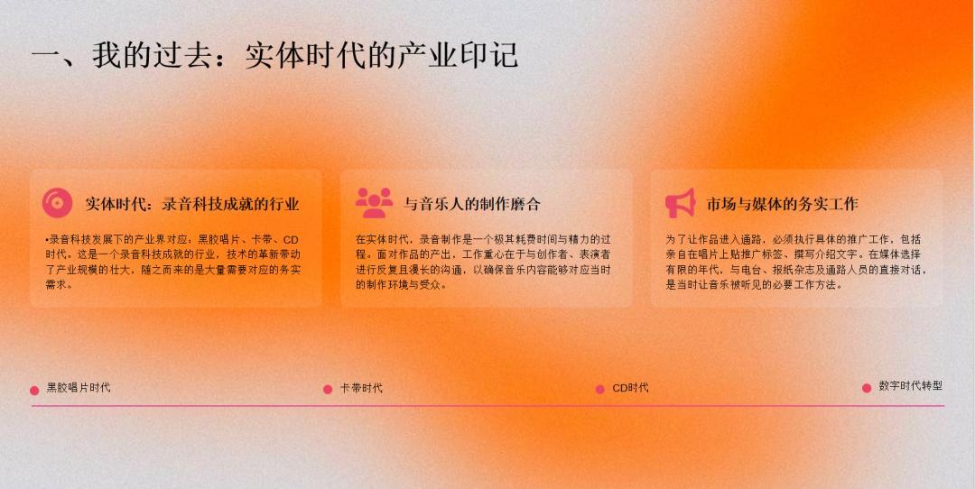 後面最大的挑戰是整個實體產業的崩盤,我那時候正好管理百代,面對數位的興起,所以當時雅虎等等這些數位平臺我是恨之入骨,見了面我都不搭理。到後來慢慢理解,因爲我發現了一件事情,唱片不是音樂產業,唱片其實是音樂產業在工業革命錄音技術發展之後產生的一種傳遞音樂的模式,音樂產業就是以音樂爲核心相關的互動、延伸、發展參與的人、事、物形成的一個面,那叫音樂產業。