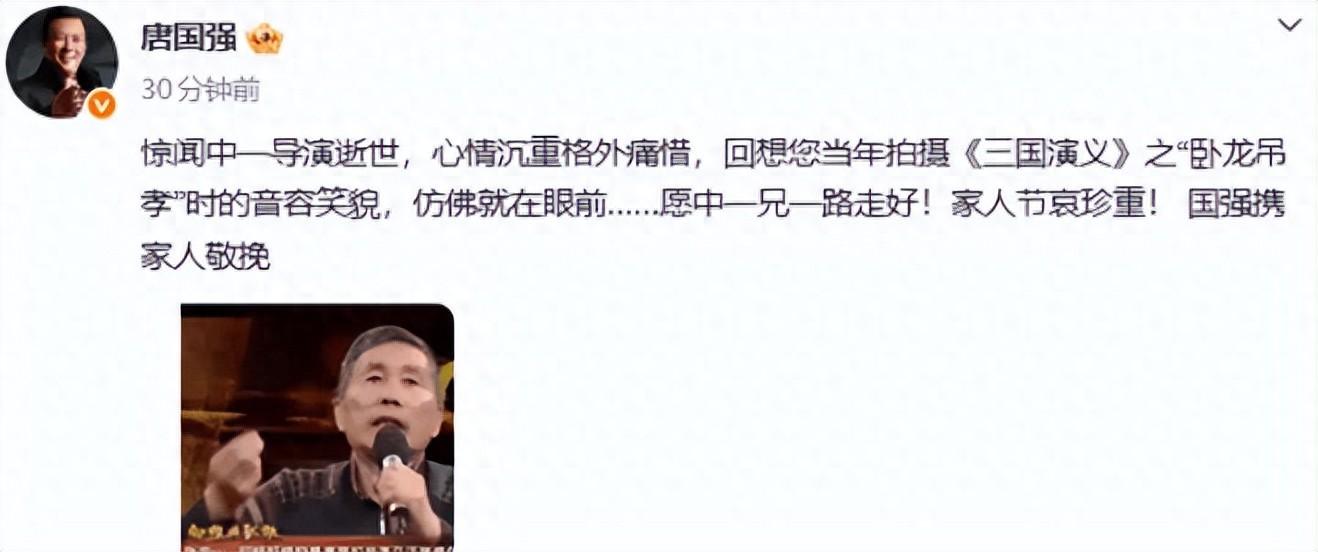 搜狐娛樂訊 2月10日,《三國演義》導演之一張中一被證明於2026年2月8日下午因病去世,享年74歲,張中一是94版《三國演義》的分集導演之一,拍攝了“臥龍弔孝”“姜維之死”以及大結局“三分歸晉”等經典片段。對此,唐國強發文悼念:“驚聞中一導演逝世,心情沉重格外痛惜,回想您當年拍攝《三國演義》之“臥龍弔孝”時的音容笑貌,彷彿就在眼前……願中一兄一路走好!家人節哀珍重! 國強攜家人敬輓 。”