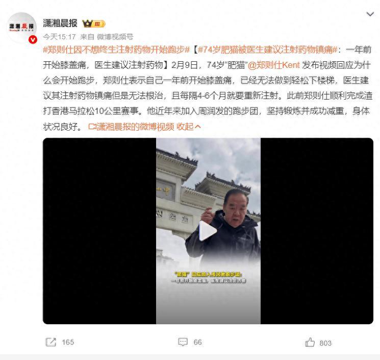 2月9日,74歲“肥貓”鄭則仕發佈視頻回應爲什麼會開始跑步,鄭則仕表示自己一年前開始膝蓋痛,已經無法做到輕鬆下樓梯,醫生建議其注射藥物鎮痛但是無法根治,且每隔4-6個月就要重新注射。此前鄭則仕順利完成渣打香港馬拉松10公里賽事。他近年來加入周潤發的跑步團,堅持鍛鍊併成功減重,身體狀況良好。
